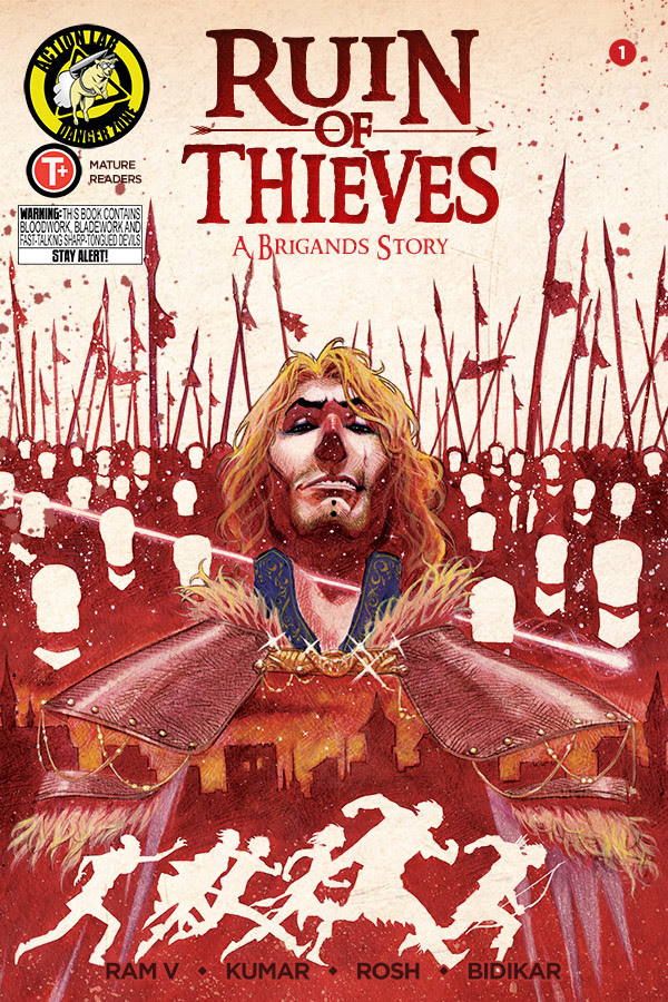 In an unusual move, Action Lab has broken the traditional press release format of introductory paragraph, quote from writer, book synopsis, quote from artist, quote from editor, vital stats, to instead present a press release written entirely by Ram V, writer of the upcoming series Ruin of Thieves: A Brigands Story. With art by Sumit Kumar and ROSH, the comic is billed as a cross between Game of Thrones and Ocean’s Eleven. The first issue is out May 30th. But let’s let Ram V tell you all about it: