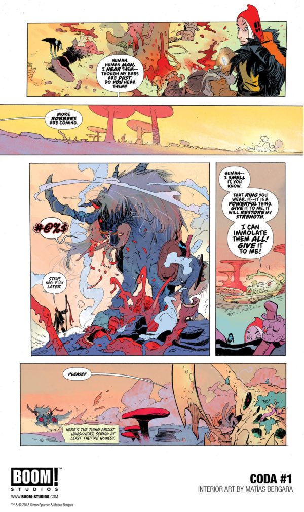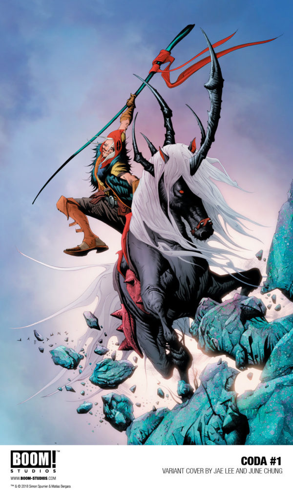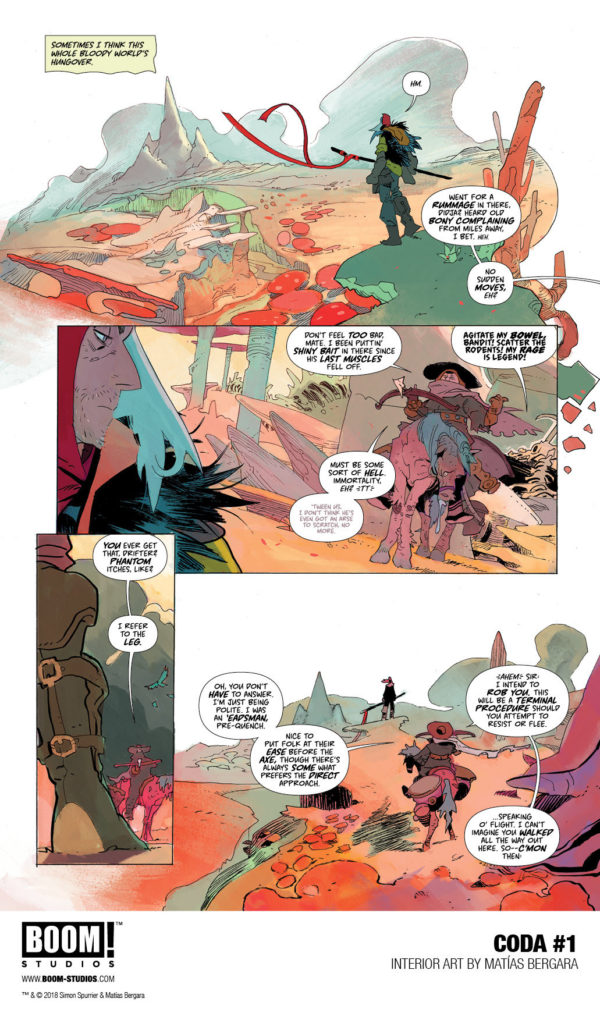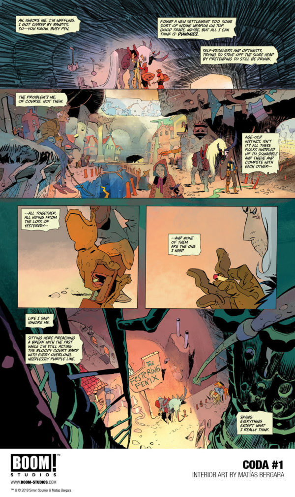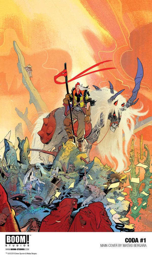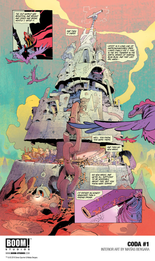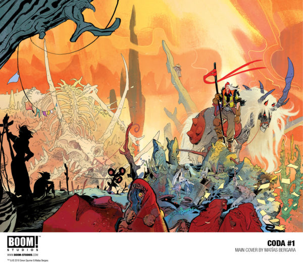 “This is Si Spurrier unleashed, creating a truly unique and exciting new world in Coda that’s equal parts Mad Max and High Fantasy,” said BOOM! editor Eric Harburn in a press release. “Teamed with Matías Bergara, who’s delivering career-defining work, these two are making sure every chapter of this twelve-issue series is a broken fantasy epic unlike anything you’ve experienced in comics or anywhere else.”