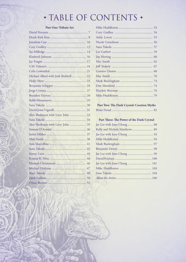 The Dark Crystal Artist Tribute features illustrations from artist luminaries and newcomers alike, including Jae Lee, David Petersen, Mark Buckingham, Cory Godbey, Jeff Stokely, Benjamin Dewey, Sana Takeda, and the film’s original concept artist, Brian Froud.