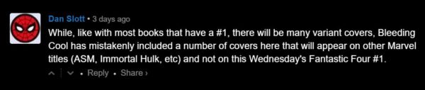 Such as with Fantastic Four #1 out tomorrow. Over the weekend, Bleeding Cool ran a collection of all of the Retailer Exclusive Variant covers we could, only for the writer of the Fantastic Four, Dan Slott himself, to drop into our comments to say: