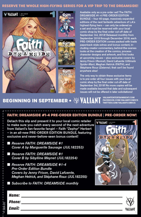 PLUS: There’s still plenty of time to reserve the FAITH: DREAMSIDE #1-4 PRE-ORDER EDITION BUNDLE with your local comic shop before the final order cut-off date of September 3rd! Featuring bonus content and incredible covers by a wealth of talented artists, including Jenny Frison (Revival), David Lafuente (Ultimate Spider-Man), Meghan Hetrick (FAITH), and StĂ©phane Roux (Zatanna)!