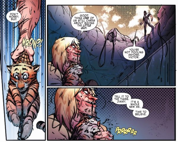 Warpath’s problem with Sabretooth is that he’s a psycho killer, which is a fair point. But Sabretooth insists that he’s changed, and he has a pet tiger to prove it.