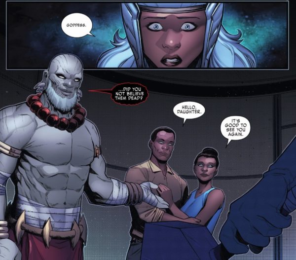 Hiari leads Storm to the hut where Uovo is hiding out. Storm summons her hammer and is all like “let’s fight” but Uovo decides has a peace offering instead. He’s brought her real parents back from the dead. That’s actually a pretty nice gesture, Uovo. Maybe you’re not so bad after all.