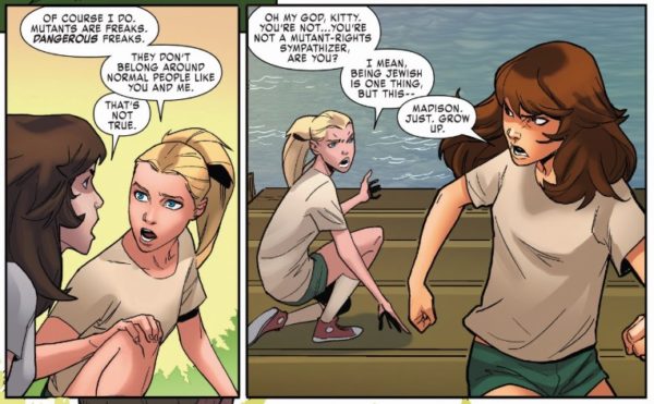 Kitty follows the junior counselors back to their cabin, finds the storeroom which apparently has all the junk they’ve stolen for years, and returns to everyone while they’re sleeping. The next day, everyone is happy to find their belongings, and the junior counselors are pissed. Kitty decides to pay them a visit the next night, dressed up as a ghost, to scare them off from stealing again. It works too well, because the next day, the counselors claim they were threatened by a mutant. Mutant bigotry is rampant throughout the camp, apparently, including amongst Kitty’s best friends.
