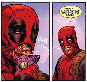 Deadpool tries desperately to remember how to use the device, but sadly, the previous series, Despicable Deadpool, ended with Deadpool wiping all his own memories. Should have thought that through. Deadpool tries everything, to no avail.