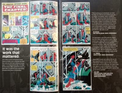 Both Doctor Strange and Spider-Man are specifically called out in visuals with many more listed, but most prominent are the words ‘It was the work that mattered’ reflecting Ditko’s strong beliefs on this matter, followed by reprinting the famous Amazing Spider-Man #33 five-page sequence across a double-page splash, alongside notes on his legacy from CCO Joe Quesada, EIC C.B. Cebulski and Spider-Man group editor Nick Lowe.