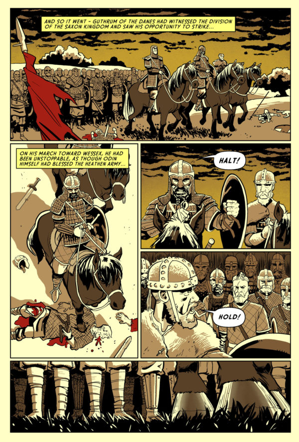 For his backstory, Mark shoots us back over 700-years of British history to the Dark Ages, a bloody war between the Saxons (Christian) and the Vikings (Pagan) ensues to seal the fate of the British Isles. Upon relinquishing his Pagan faith as a clause of his freedom upon defeat at Saxon hands, a Viking leader slowly discovers that he’s become cursed with something…something you’ll need to discover by picking up a copy of The Burning Black: Legend of Black Shuck.