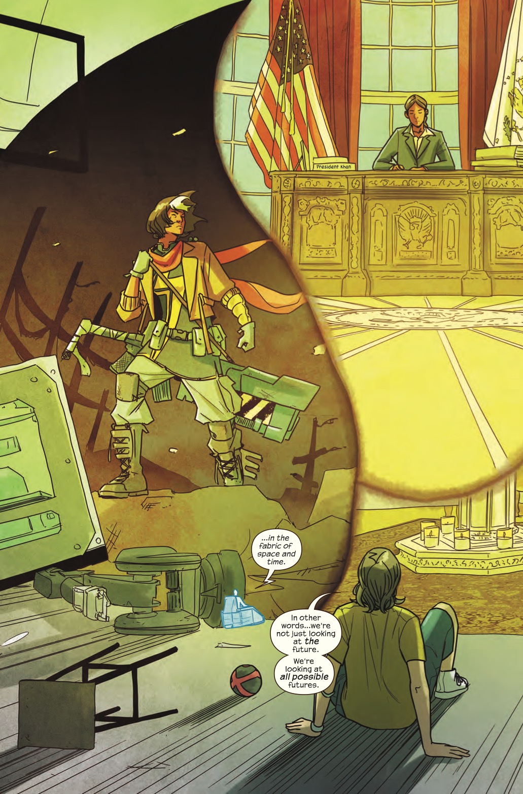 Marvel has a released preview of next Wednesday’s Ms. Marvel #34, in which Bruno, looking to find out why Ms. Marvel’s powers have gone haywires, gets a look through a rift in space and time. What does he find? Just a little look at every possible future. And a few of them look familiar. There’s the resistance-leading future Ms. Marvel featured in the first story arc of the current Exiles ongoing. There’s President Kamala Kahn, seen in the Old Woman Laura story from the final issues of All-New Wolverine.