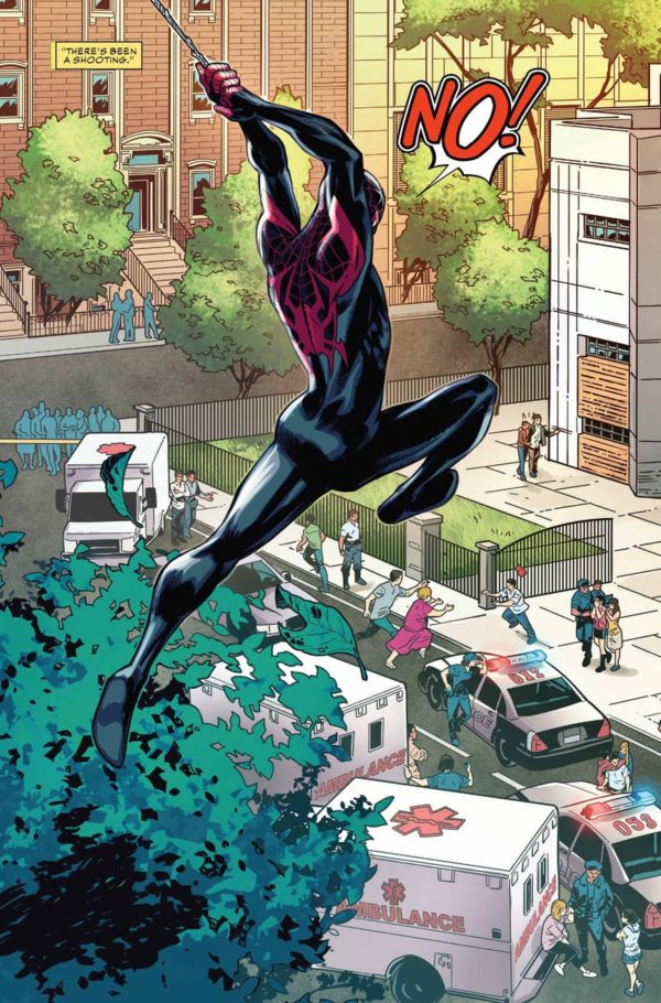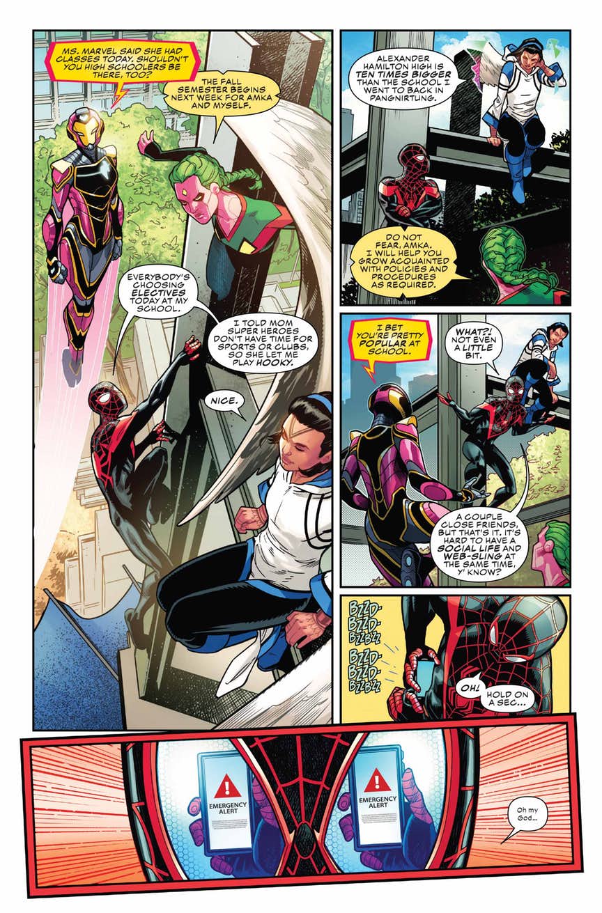Marvel has released a preview for Champions #24, otherwise known as “the school shooting issue.” The special topic was revealed back in August, and it hits stores next week. And today, Marvel released a preview, revealing a little more info about what will happen in the issue, and who might be most personally affected, as Miles Morales gets an alert revealing that the shooting takes place at the Brooklyn Visions Academy.