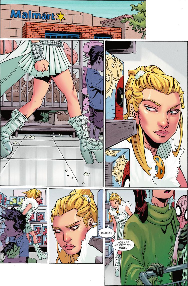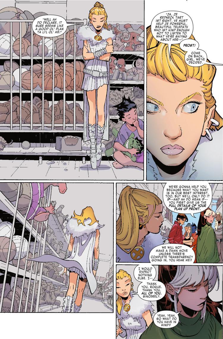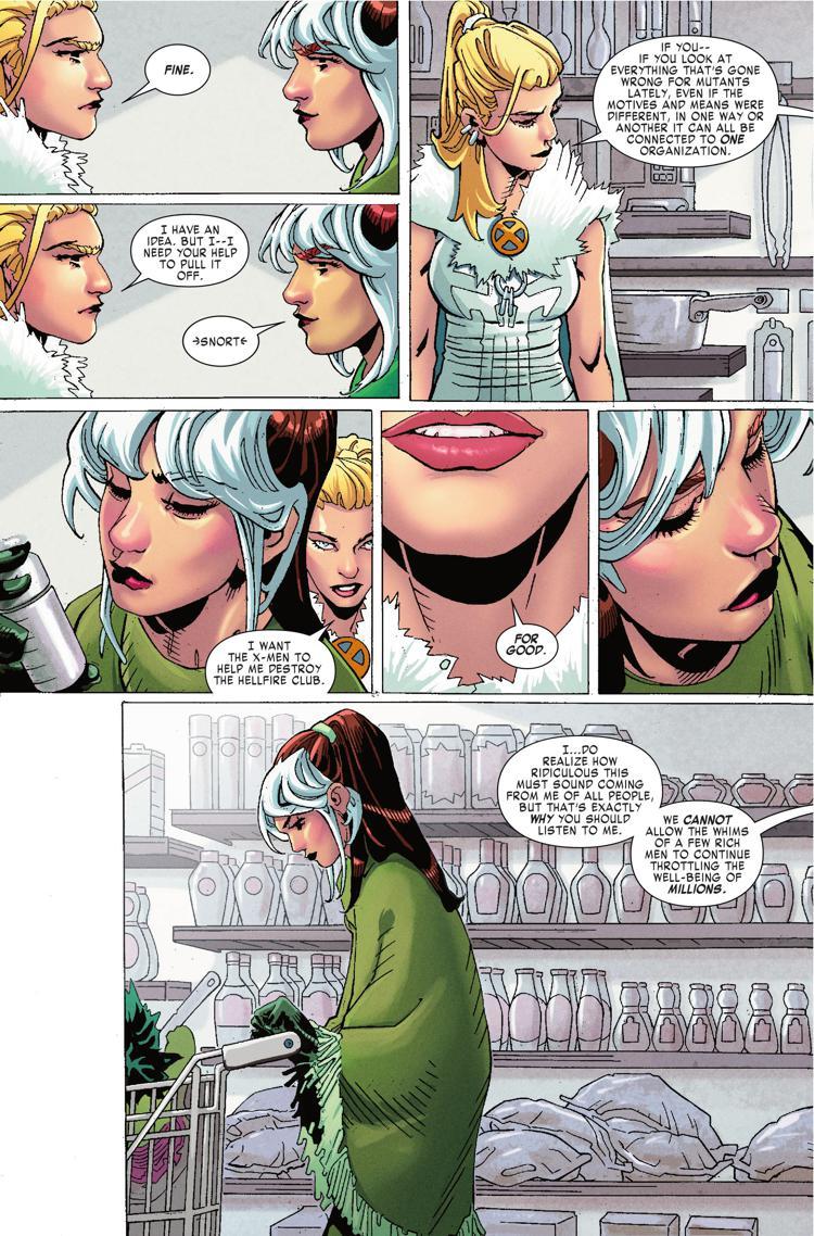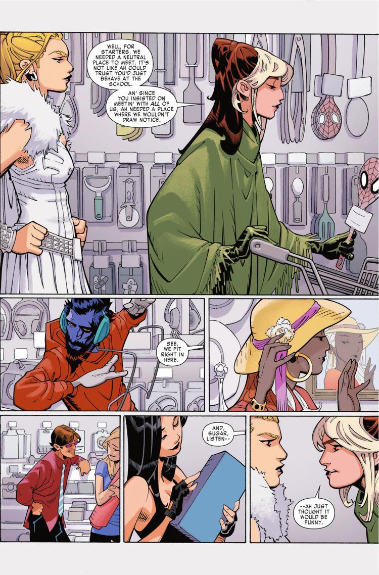 DC Comics may be making retailers angry with their Walmart-exclusive 100-page giant comics featuring Superman and Batman, but Marvel Comics is taking the Walmart wars to the next level. In next week’s X-Men Black: Emma Frost, when the White Queen requests a meeting with the X-Men to discuss taking down the Hellfire Club, Rogue asks her to meet them for a live appearance in the comic book industry’s favorite retail location.