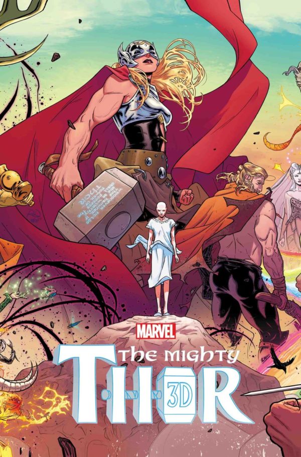 Jane Foster brings the thunder like you’ve never seen it before — in eye-popping 3-D! When Jane lifts the mystic hammer Mjolnir, she is transformed into the Goddess of Thunder — the Mighty Thor! Her enemies are many, as Asgard descends further into chaos and a looming war threatens to spread throughout the Ten Realms. Yet this new Thor’s greatest battle will be against a far more personal foe: the cancer that is killing her mortal form. It’s a legend in the making as the multi-layered writing of Jason Aaron and the larger-than-life artwork of Russell Dauterman leap off the page in three dimensions! Polybagged with a pair of 3-D glasses! Reprinting MIGHTY THOR (2015) #1.