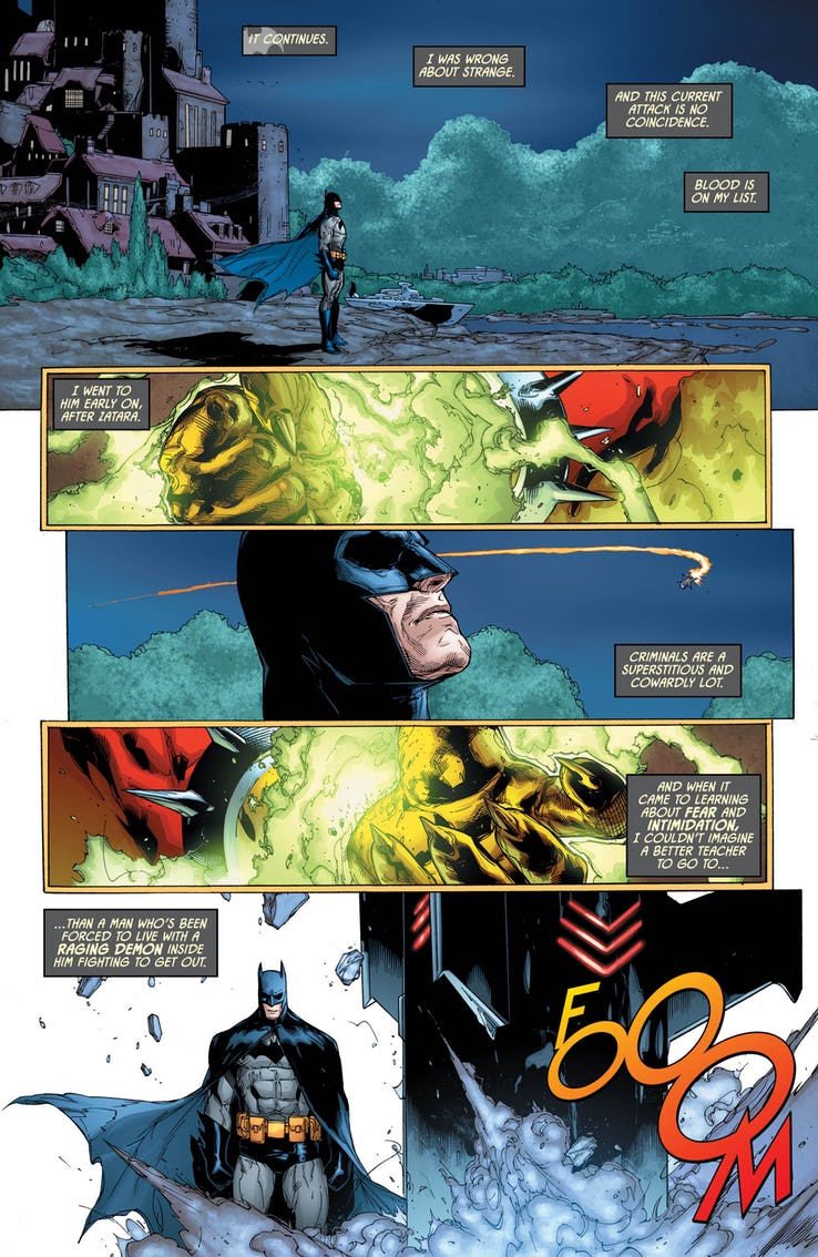 The next stop in Batman’s investigation of the monsters he’s been fighting is Jason Blood, who shares a body with the rapping demon Etrigan. That gives Batman, and Peter Tomasi, an opportunity to revisit the Hellbat armor first forged back in Batman and Robin (the comic book series, not the awesome movie — this suit does not feature bat nipples).