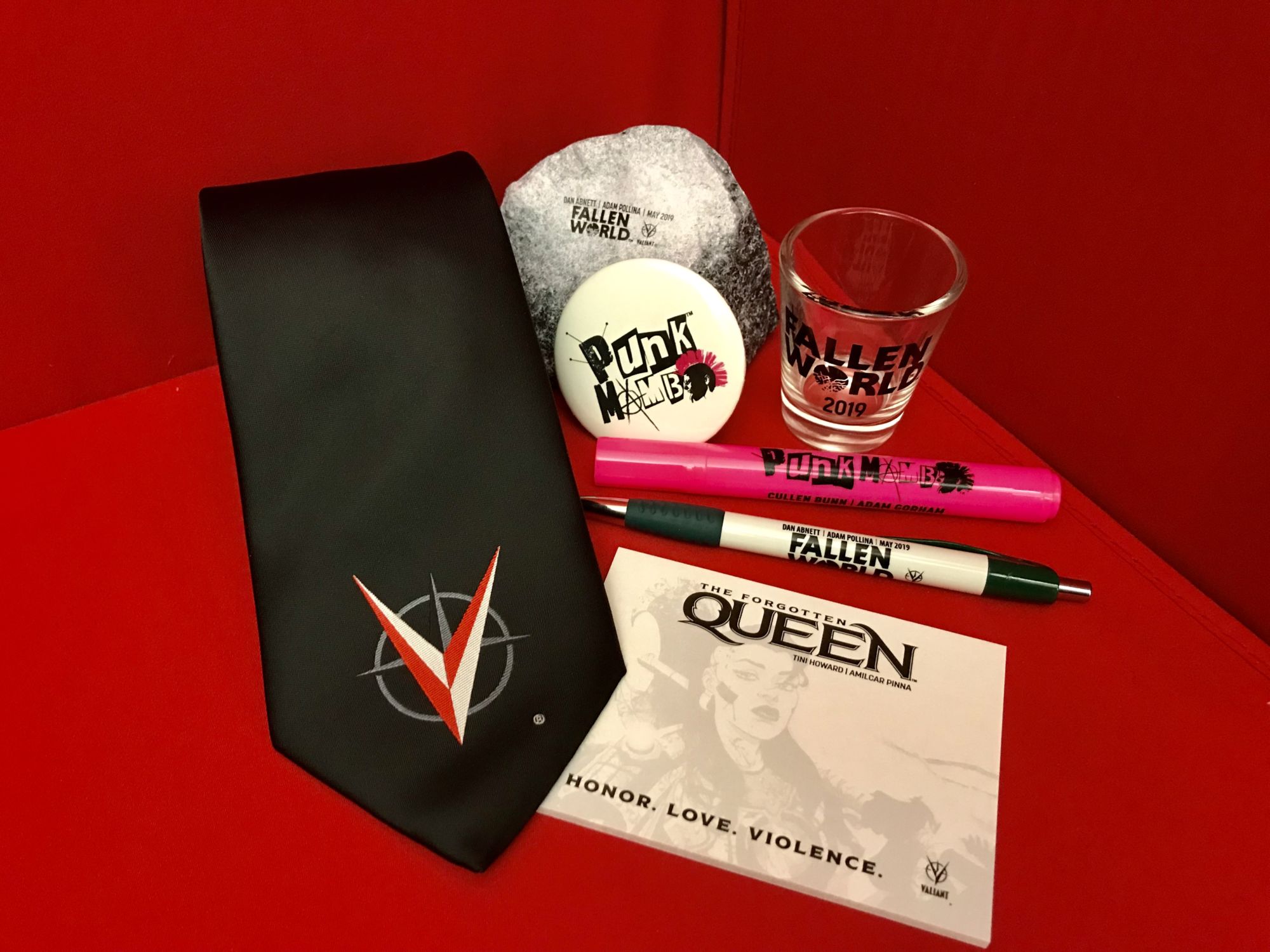 ComicsPRO attendees will also receive “Welcome Bags” from Valiant and even more retailer-exclusive goodies during roundtable chats with Valiant staff. Want to relieve some stress? Squeeze a chunk of New Japan with the FALLEN WORLD stress ball, based on the upcoming series by Dan Abnett and Adam Pollina debuting on May 1st. Need to jot down some important secrets? Use the FALLEN WORLD pen! And after a long day, unwind with the FALLEN WORLD shot glass.