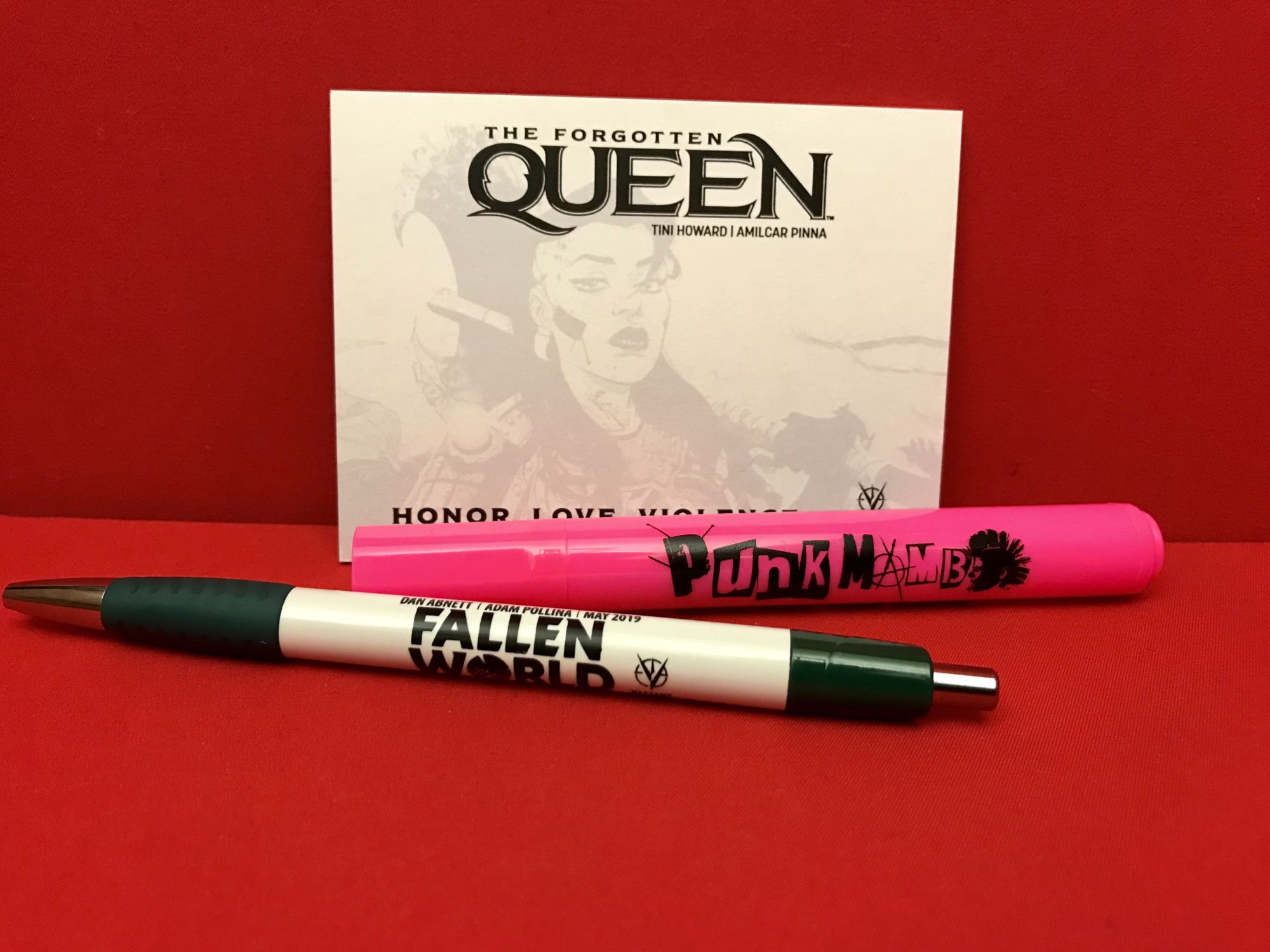 Show the world you rock by sporting a PUNK MAMBO pin, based on the gritty new series debuting April 24th by Cullen Bunn and Adam Gorham. Or use the PUNK MAMBO pink highlighter to brighten your scribbles on THE FORGOTTEN QUEEN sticky notes, based on the phenomenal new series by Tini Howard and Amilcar Pinna coming out on February 27th. There may or may not be some other fun items. (Spoiler: There are.)