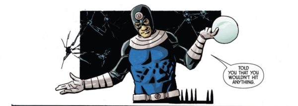 As the issue starts, Mayor Kingpin is watching television news, where he learns about Bullseye’s attempt to kill Logan in an organic supermarket, which is not the kind of attention Kingpin wants. In Midtown, Bullseye has cornered Sarah Dewey, the author of Kingpin’s biography, and obtained the USB drive that may contain information damaging to Kingpin. Sarah tries to persuade Bullseye to give her the drive so she can ruin Kingpin, tempting him with the resulting power vacuum.
