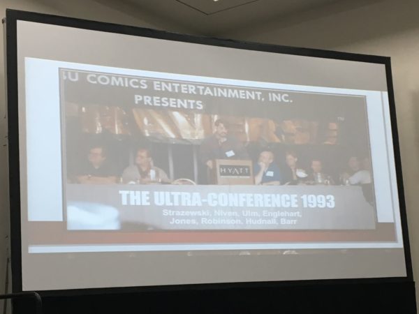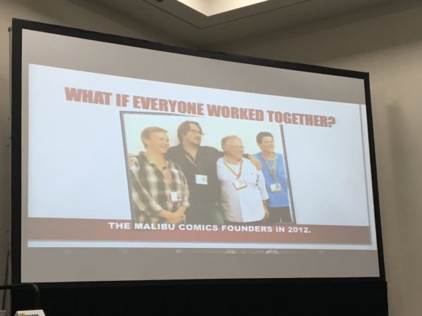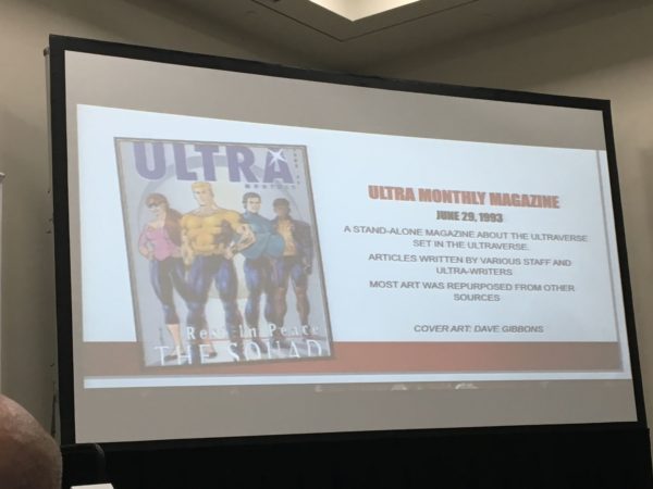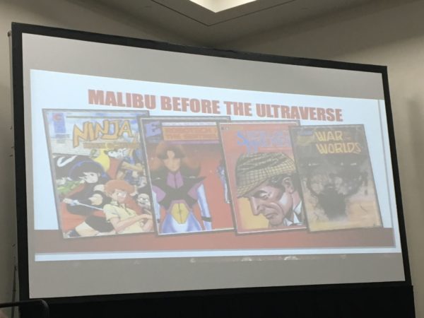 As for the line’s later years and demise (the panel was running late and had to speed up toward the end) all in attendance agreed that “it all went south when Marvel took over.” One of the last pieces of artwork shown was that of the Marvel characters meeting those of the Ultraverse, which occurred after Marvel bought Malibu Comics. No one in the audience seemed happy to see this.