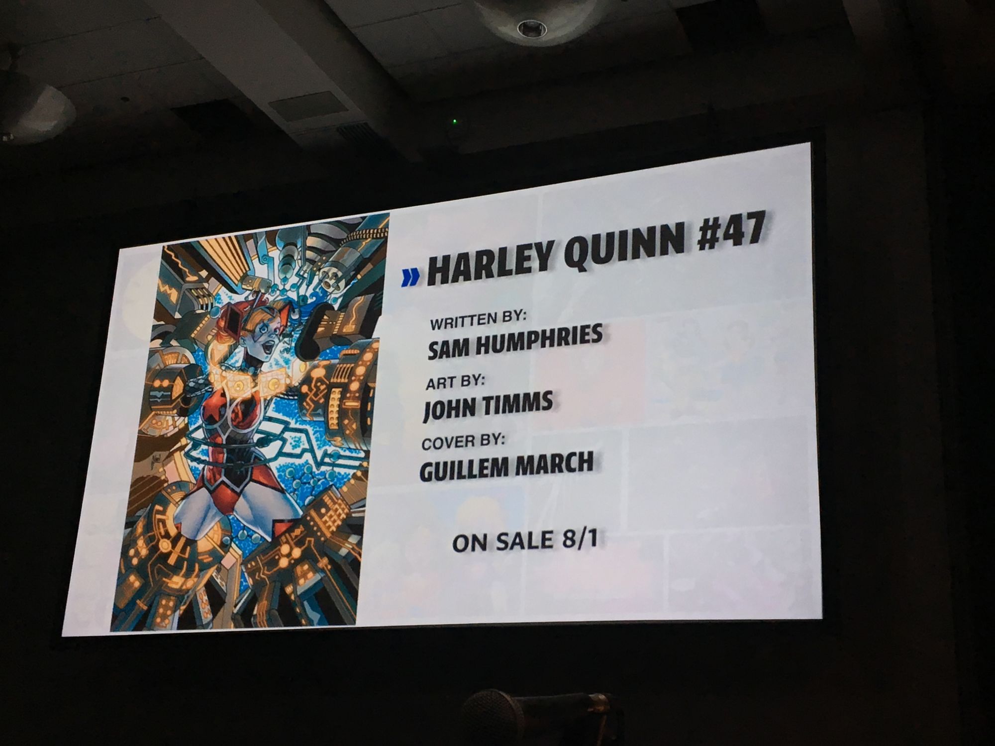 Humphries continues to work on the Harley Quinn title with art by John Timms, who was in the audience. “Harley Quinn needs to move closer to the center of the DCU… how better than to send her to Apokolips?” Humphries plans for her to join Female Furies as “Hammer Harleen”. He reminded fans that in-story there is a Harley Quinn comic, and he wants to explore who is creating that. Someone in the audience asked what his favorite Harley Quinn costume is, and he admitted that he “has a soft spot for the one from Arkham Asylum.”