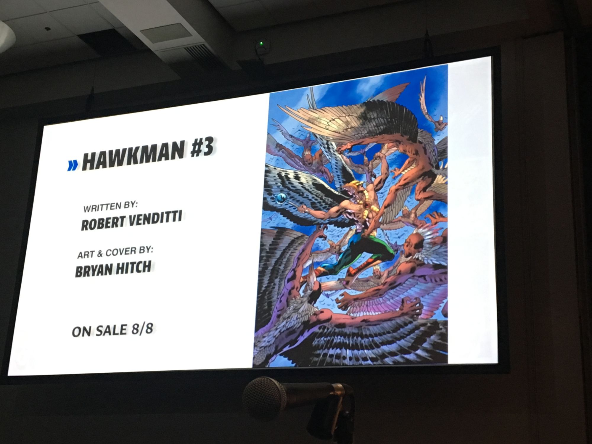 Venditti is writing Hawkman with art by Bryan Hitch. He sees the character as the Indiana Jones of the DCU. DC Metal recently revealed the character has been alive for 10,000 years, far more than what was previously believed based on his Ancient Egyptian origins, and that he reincarnates across time and space. Even the Silver Age cop, Katar Hol, was just a single persona. Venditti wants to explore “the mystery of his lifetimes” because the character cannot remember anything from his past lives but did leave clues that only he would comprehend. Venditti wants to “give it up for hairy chests.” Fans will see a Rannian Hawkman, with a jetpack, as well as a Kryptonian one.
