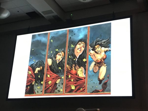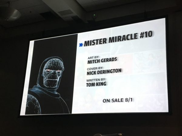 The panel began by congratulating Gerads on his Eisner win the night before for his artwork on Mister Miracle. Gerads reminded the audience that it was apparently the longest Eisner ceremony on record and that he was very tired. He added that coming up in the title fans can expect to see a reinterpretation of the classic Jack Kirby New Gods story ‘The Pact’ featuring Darkseid and Scott Free’s own son. Scott will struggle with whether or not to make the same deal his own father, Highfather, did with him to preserve the greater good. He lamented, “I haven’t had a chance to draw anything other than a nine panel grid in a while. What’s a splash page?”