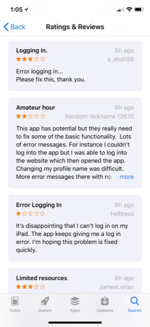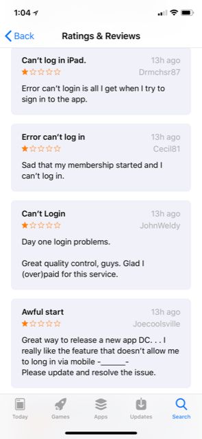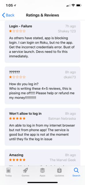 However, even if you live in the USA you may have trouble. While the website, Android and ROKU TV app versions seem to be rolling along and delighting folks, the iOS app version is a little buggier. People have difficulty getting into it. And the App Store review score is plummeting as a result.