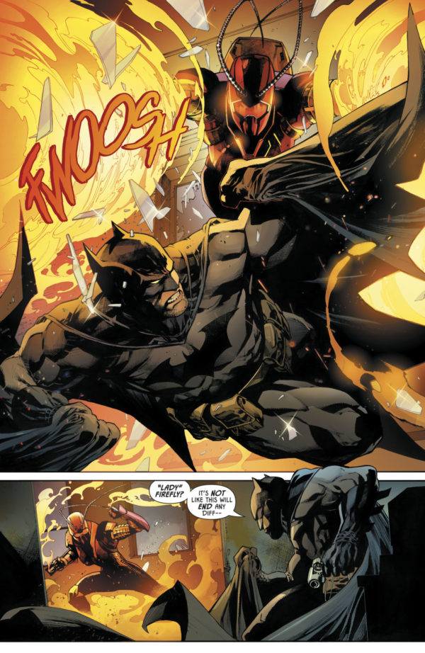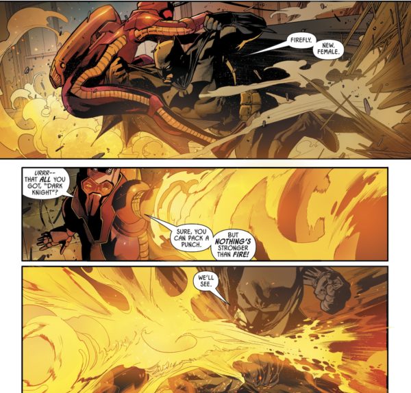 Did someone miss their cue? Was someone meant to have said ‘Lady Firefly’ in order to justify Batman’s questioning response? It’s not as if she is a silent assailant…