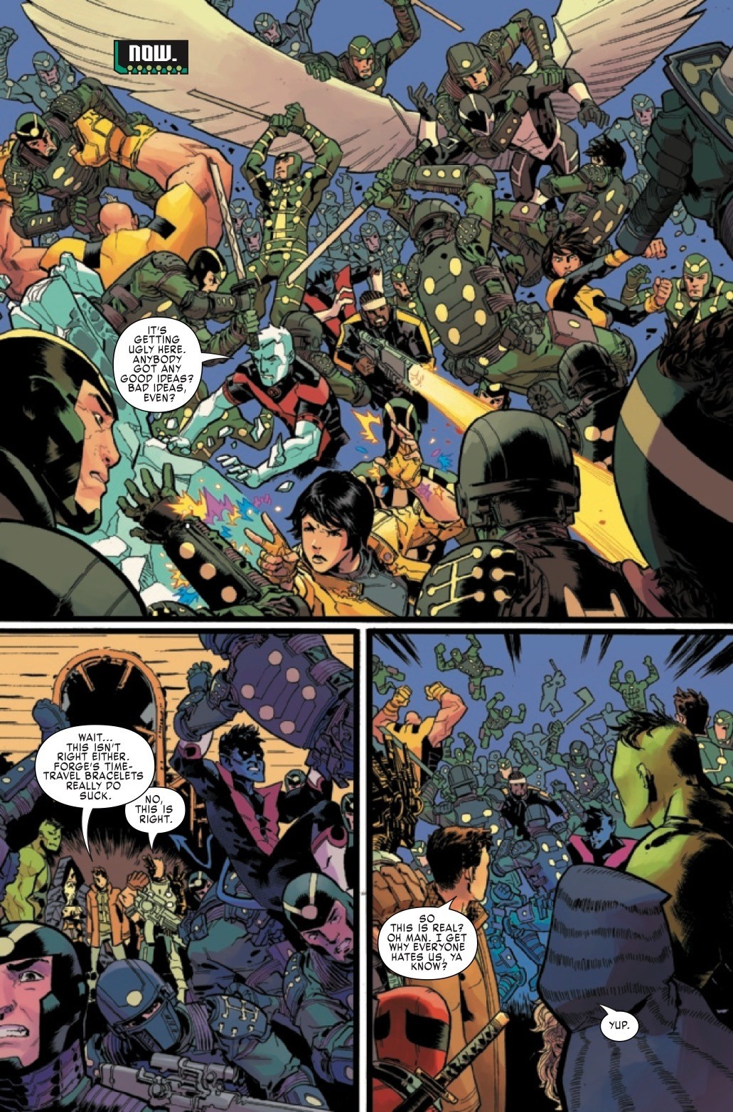 More is explained in the preview, and presumably even more in the full issue. Because good guy Matthew Rosenberg would never end two miniseries in a row with cliffhangers, would he? @#$%, we’re not gonna be left with more questions than answers, aren’t we? And we’ll have to buy Uncanny X-Men #1 for $7.99 in November to answer those? Damn you, Rosenberg!