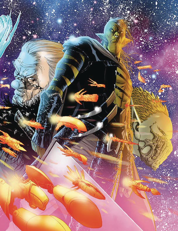In time for Free Comic Book Day the bad guys take over the Galaxy’s Greatest Comic with a nefarious new special full of criminal capers and villainous ventures: the 2000 AD Villains Takeover! At the low, low price point of 99 cents, this is the ideal shelf-stuffer to tempt roguish readers into the world of 2000 AD! In this improper issue we have the very best forbidden felons and outlandish outlaws – the lawman of the future faces a familiar rictus grin in Judge Death: The Judge Who Laughs by Rob Williams and Henrik Sahlstrom; there’s fiendish fantasy with Lord Weird Slough Feg: Lord Of The Hunt by Pat Mills and Kyle Hotz; there’s chem-wreathed criminality in the world of Rogue Trooper in Brass and Bland: The Professionals by Karl Stock and Kael Ngu; there’s the malefactory mutant-bountyhunters-turned-bad-guys, The Stix, from Strontium Dog in Stix: Sleeping Dogs Lie by Matt Smith and Chris Weston; and all rounded off by Terror Tale: Last of the Hellphibians by that master of the mendacious Henry Flint!