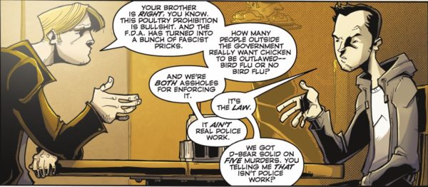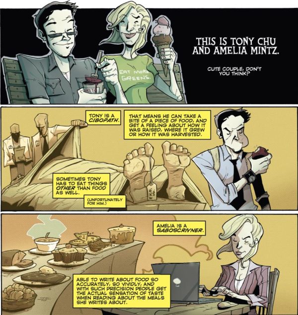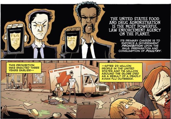 Set in a world where all chicken and other bird meats are illegal, after a catastrophic outbreak of the bird flu that killed 23 million Americans, Chew centres on Tony Chu, a police detective and FDA agent who is a Cibopath, and it turns out the world is now full of people with food-based superpowers. And it all ties in to why there is a ban on chicken and who the real masters are.