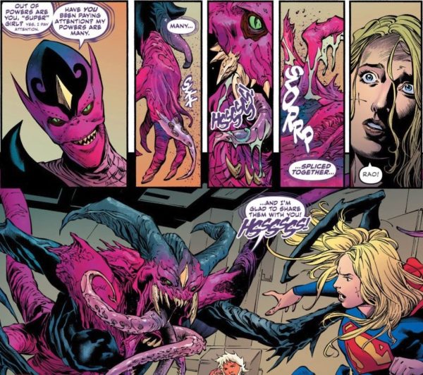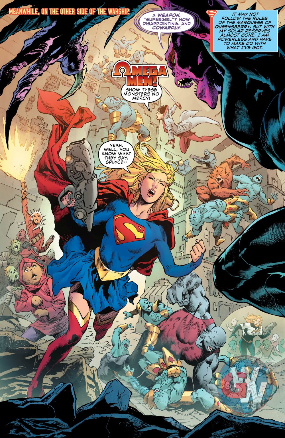 The titular Supergirl is in a lot of trouble in tomorrow’s Supergirl #27. Trapped in a battle alongside the Omega Men on board the Citadel’s warship, she’s running out of her solar reserves and facing off against the monstrous Splyce. But is Splyce all bad? Well, if you can set aside her penchant for making bad puns about her powers being “spliced together,” it seems that she’s at least willing to share her abundance of powers with Supergirl.