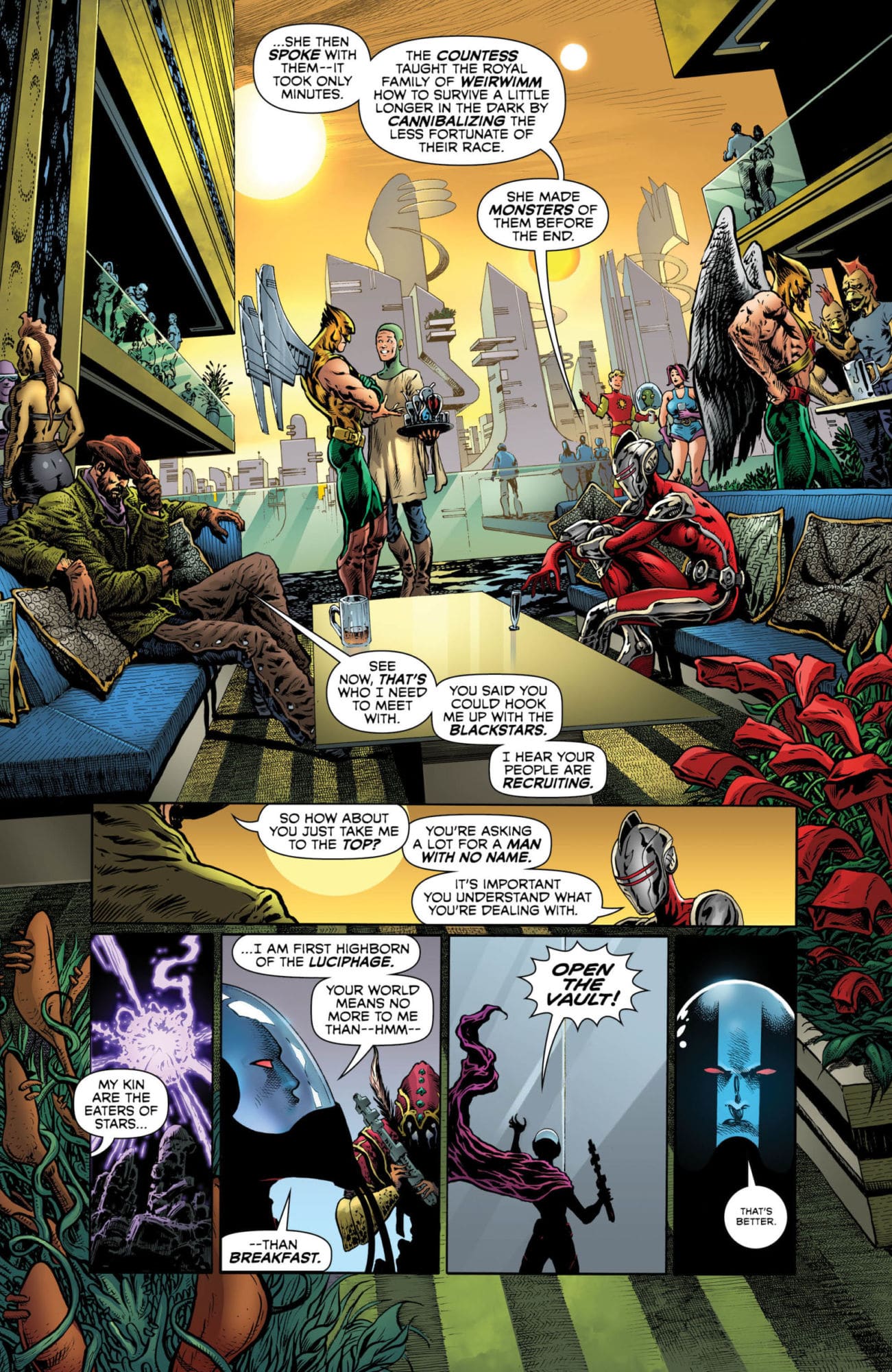 In a bar on Rann, two shrouded strangers recount two blood-chilling narratives-one in which a Blackstar heavyweight demands access to a secret vault on planet Weirwimm, threatening its gruesome annihilation with Sun-Eaters; and the other about maverick Hal Jordan and his small cadre of GLs struggling to destroy those same Sun-Eaters. And the cliffhanger-as any TGL fan will tell you about this book-may stun you enough to buy two copies!