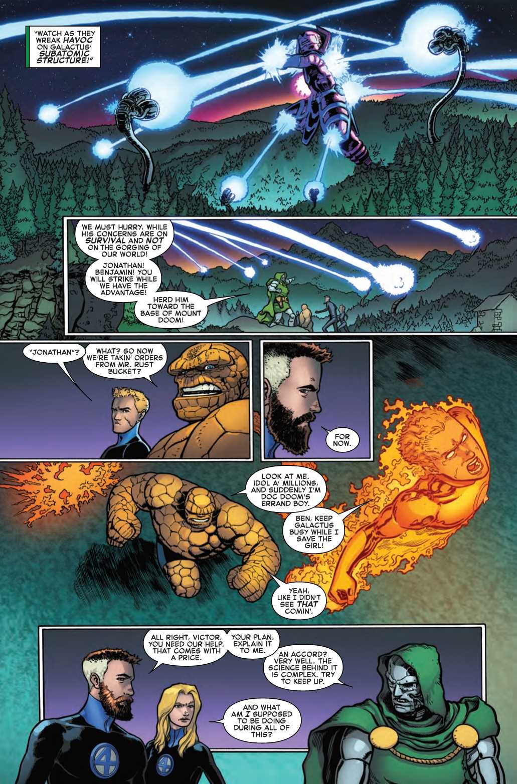 The Fantastic Four have only been back for six issues (five if you take into account that they weren’t actually reunited in the first issue of the series), but are they already so desperate they’re willing to take orders from Doctor Doom?! In this preview of next week’s Fantastic Four #7, the Fantastic Four learn that Doctor Doom had everything planned out before Galactus’s attack.