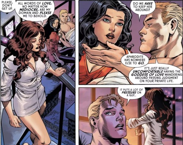 Steve Trevor seems to be experiencing feelings of inadequacy in this week’s Wonder Woman #64. Coming out of the events of Wonder Woman’s first story arc with its new creative team, Aphrodite is crashing with Steve and Diana, and if you thought having Wonder Woman for a girlfriend was hard enough to live up to, imagine having the actual goddess of love hanging around and… judging you.