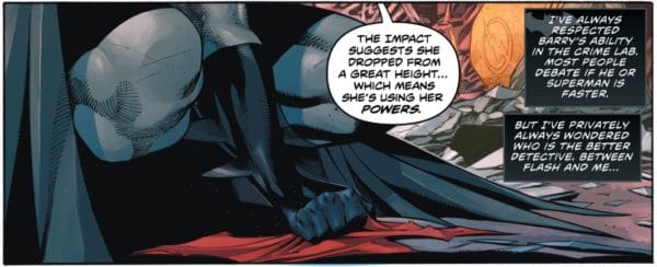 In next week’s Flash #64, continuing the crossover between Batman and The Flash, these two heroes share their own private thoughts on the matter via caption box. For Barry Allen, it’s no question: Batman is the best.