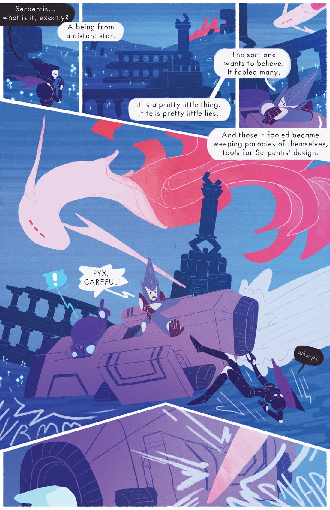 Ophiuchus is a strange, personal project—it was based on a dream I had about trying to return home to a dead world, and confronting the ghost that was left of it. We really went into it hoping to eventually turn it into a book one way or another, but we never quite expected the reception we got, and we almost lost our minds when Image decided to print it. We always felt the comic would be best in print, and that really went into every aspect of making it, so we’re extremely excited for it to reach a new audience in its intended format. The comic holds a lot of our love, so if you’re interested in loss, revenge, skeletons and robots, this is a comic for you.