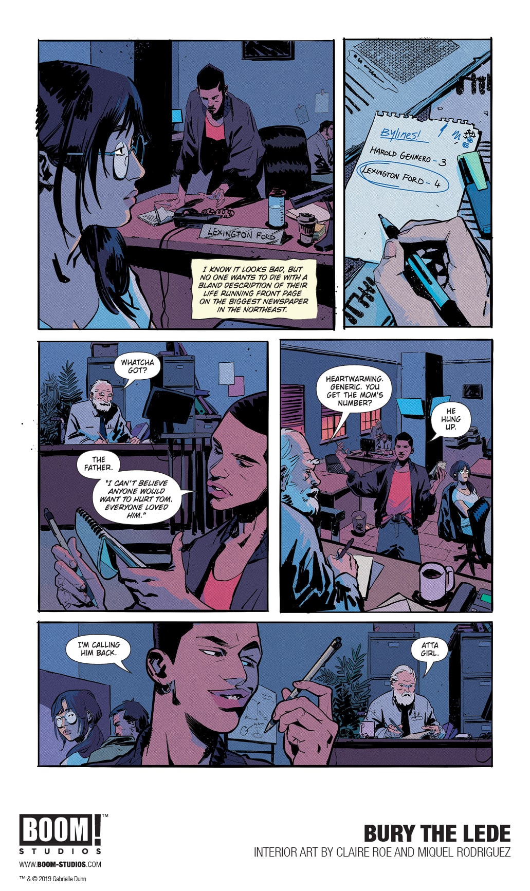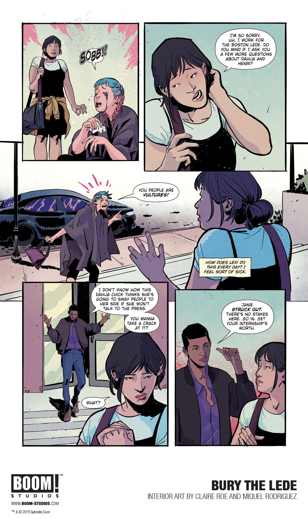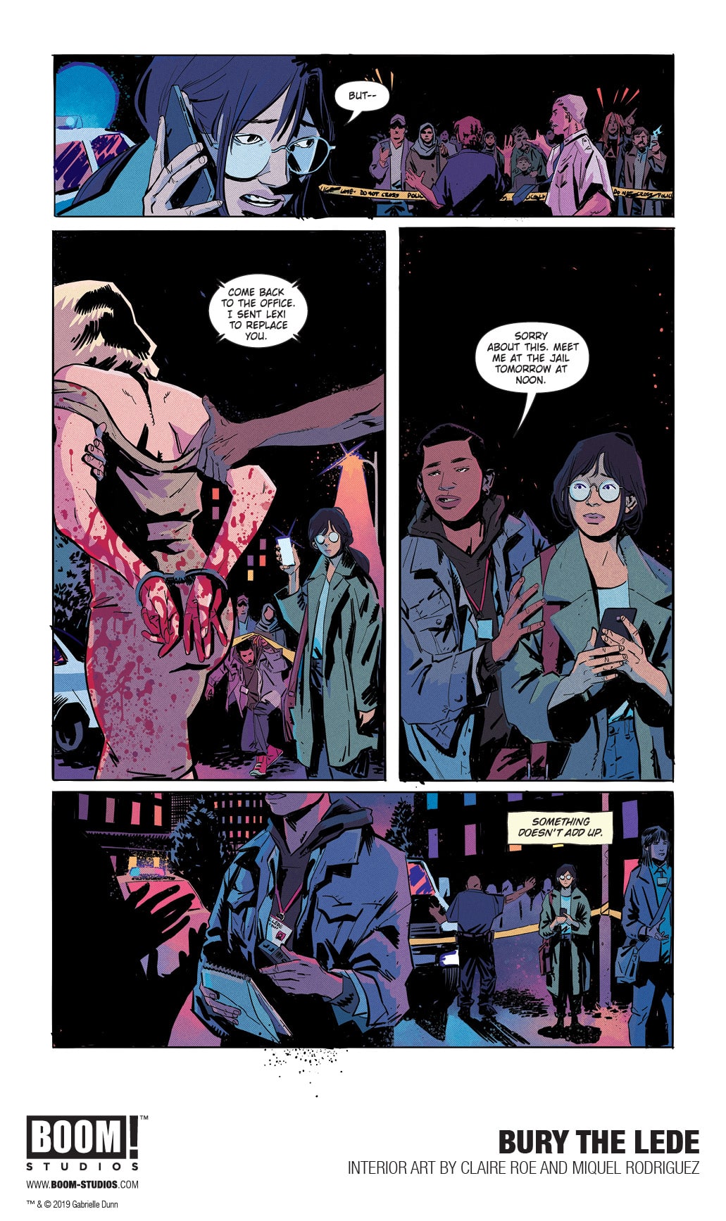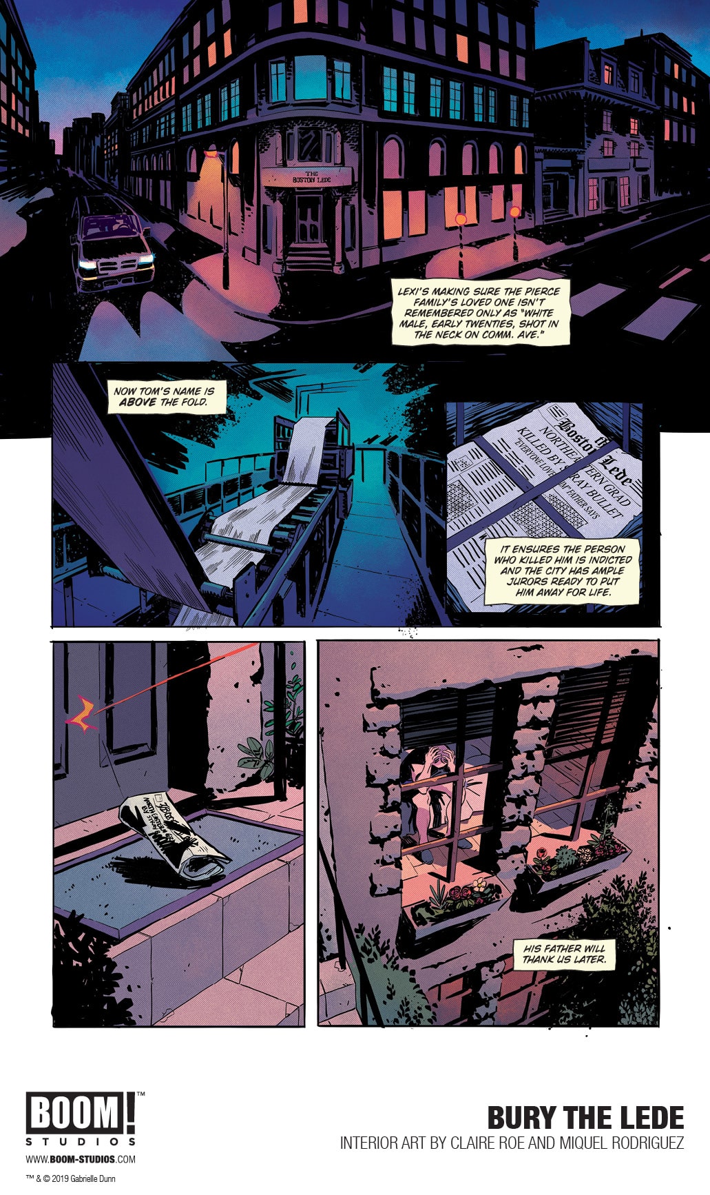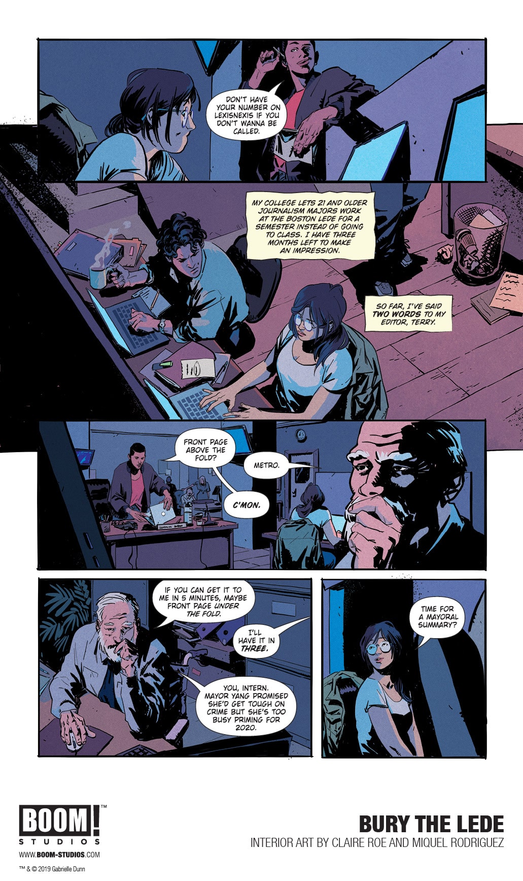 BOOM! Studios today revealed a first look at BURY THE LEDE, a new original graphic novel from New York Times bestselling author Gaby Dunn (Bad with Money, I Hate Everyone But You) and artist Claire Roe (Batgirl and The Birds of Prey), with colors by Miquel Rodriguez, which arrives in stores October 2019. Inspired by Dunn’s own experiences as a young reporter at The Boston Globe, BURY THE LEDE is a thrilling story about a young reporter’s search for truth leading her down a dark path while she goes toe-to-toe with a potential killer.