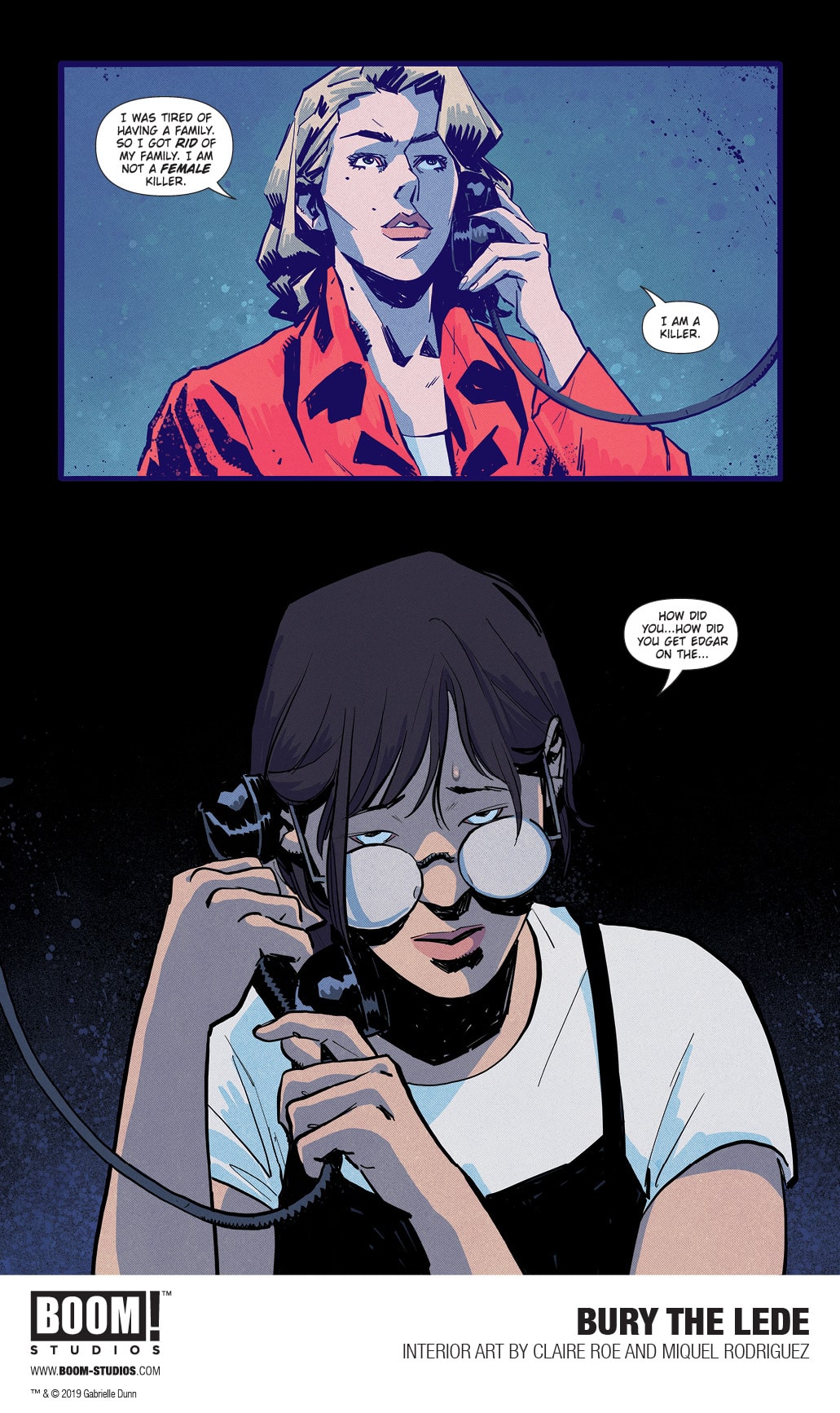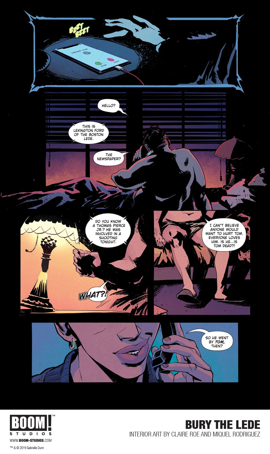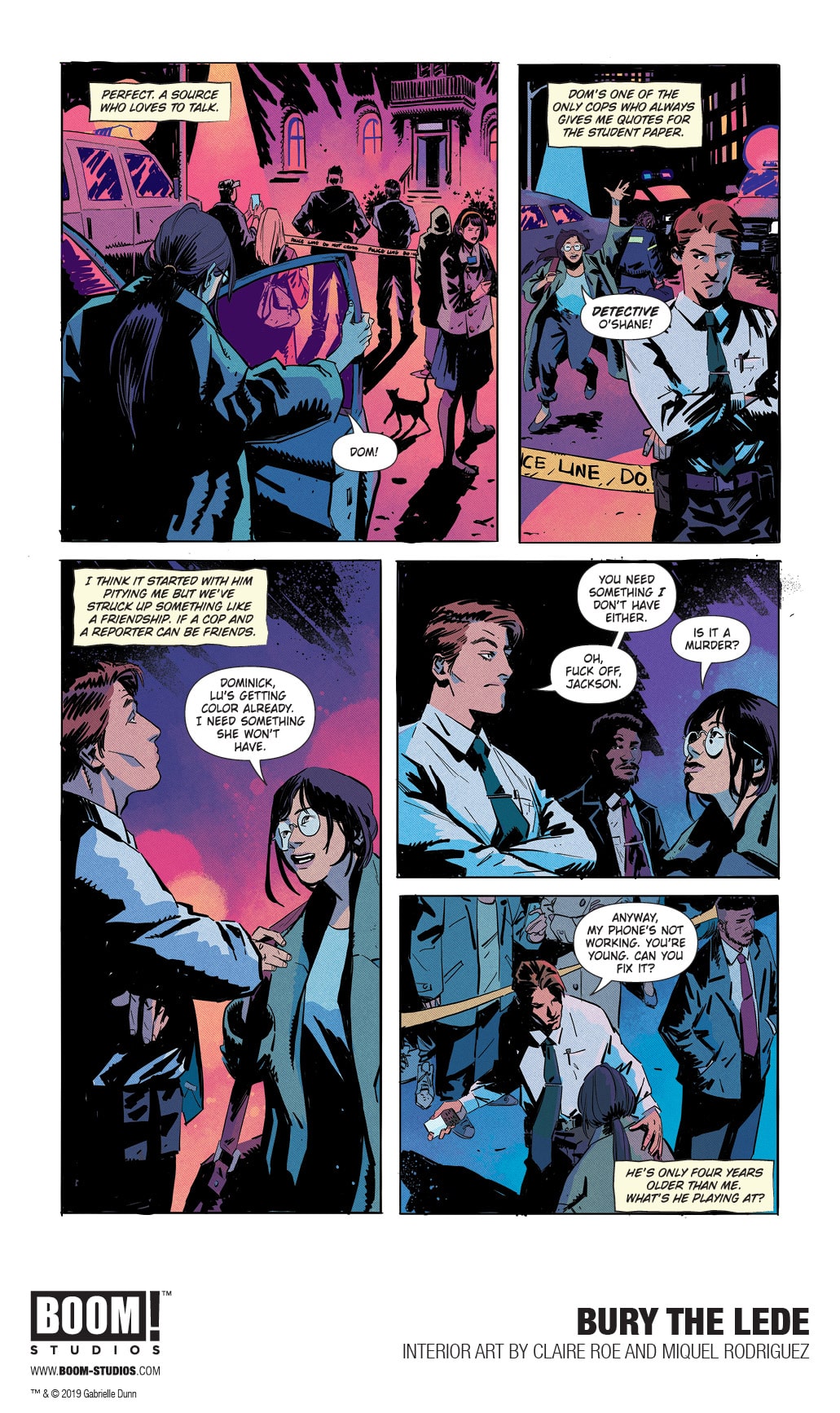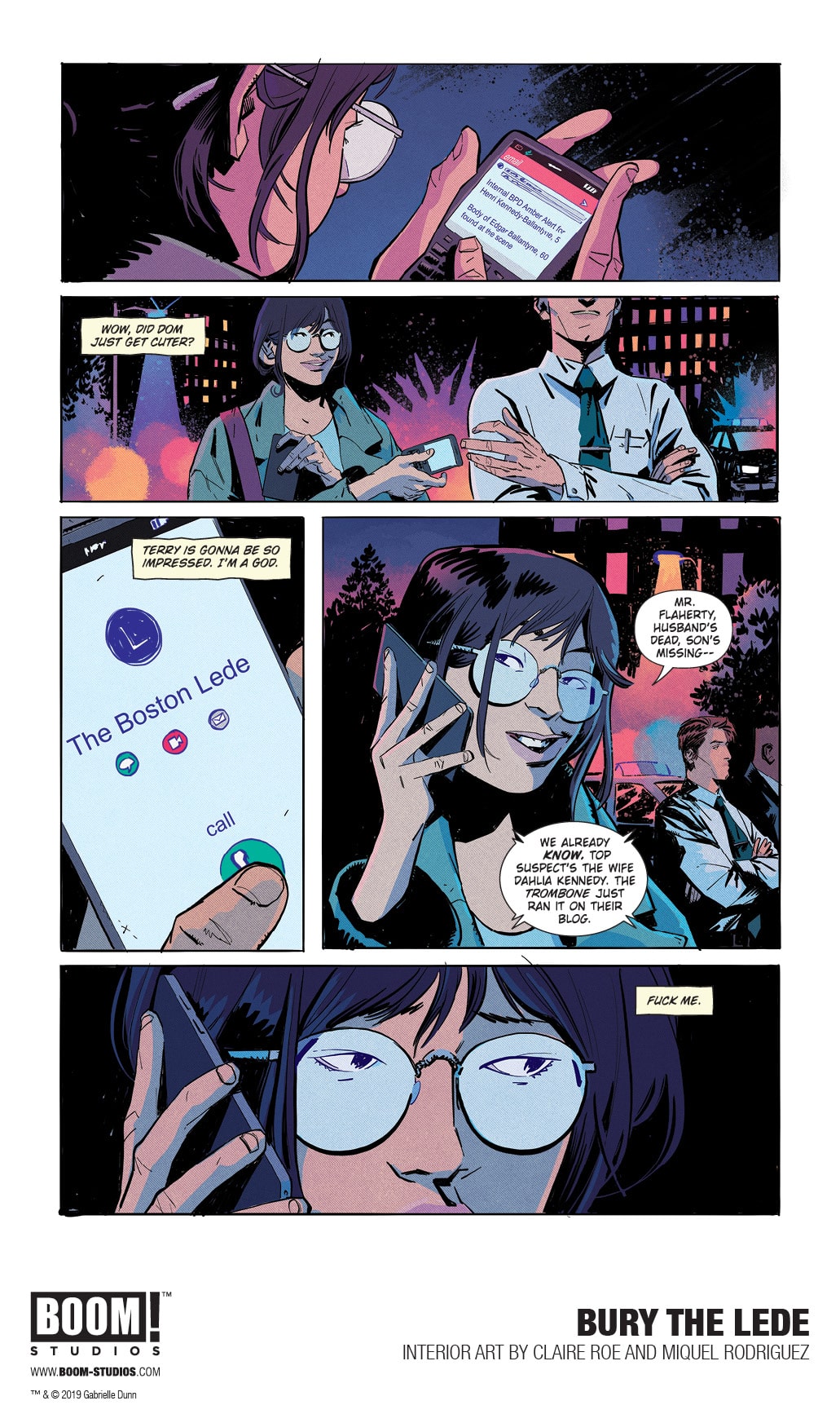BOOM! Studios today revealed a first look at BURY THE LEDE, a new original graphic novel from New York Times bestselling author Gaby Dunn (Bad with Money, I Hate Everyone But You) and artist Claire Roe (Batgirl and The Birds of Prey), with colors by Miquel Rodriguez, which arrives in stores October 2019. Inspired by Dunn’s own experiences as a young reporter at The Boston Globe, BURY THE LEDE is a thrilling story about a young reporter’s search for truth leading her down a dark path while she goes toe-to-toe with a potential killer.