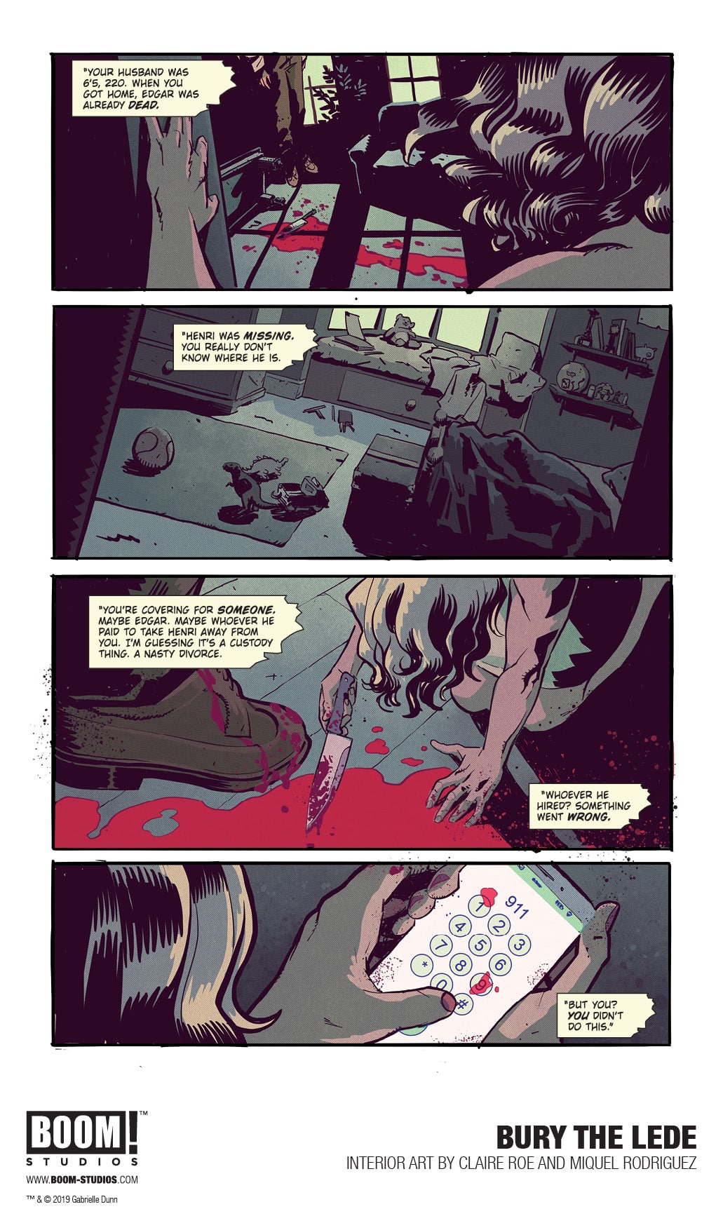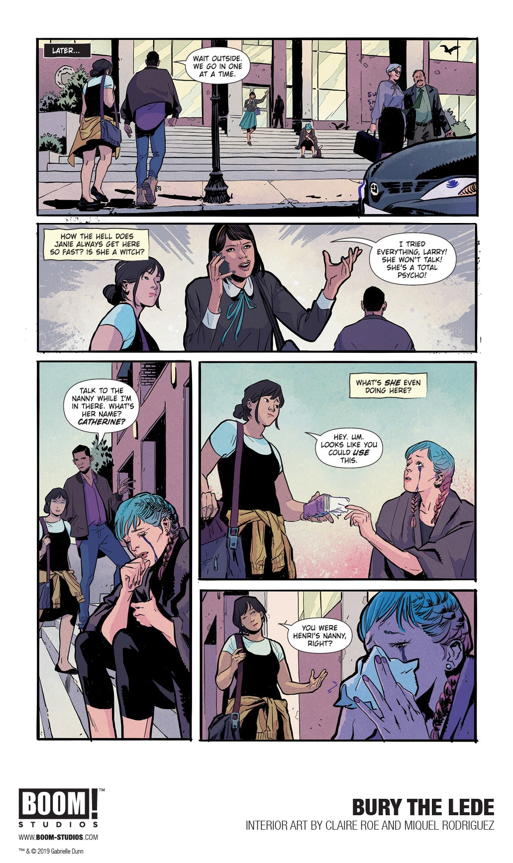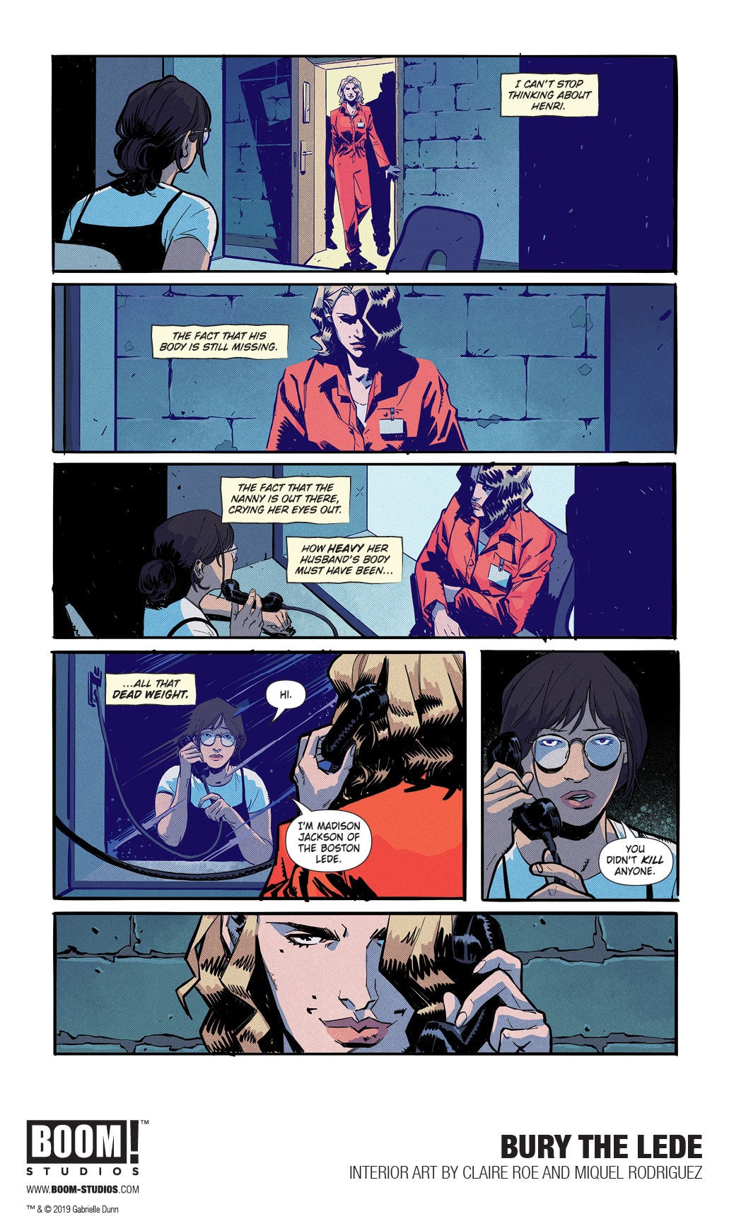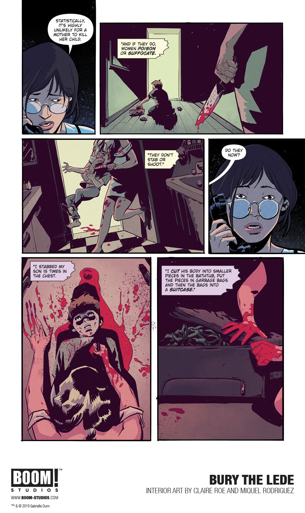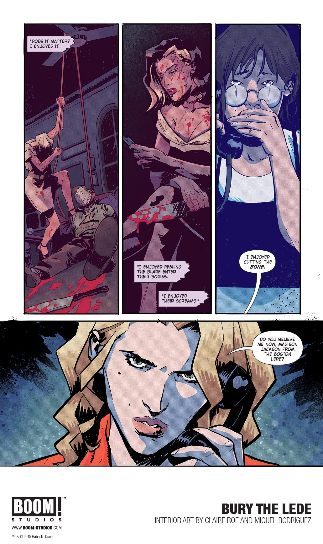 BOOM! Studios today revealed a first look at BURY THE LEDE, a new original graphic novel from New York Times bestselling author Gaby Dunn (Bad with Money, I Hate Everyone But You) and artist Claire Roe (Batgirl and The Birds of Prey), with colors by Miquel Rodriguez, which arrives in stores October 2019. Inspired by Dunn’s own experiences as a young reporter at The Boston Globe, BURY THE LEDE is a thrilling story about a young reporter’s search for truth leading her down a dark path while she goes toe-to-toe with a potential killer.