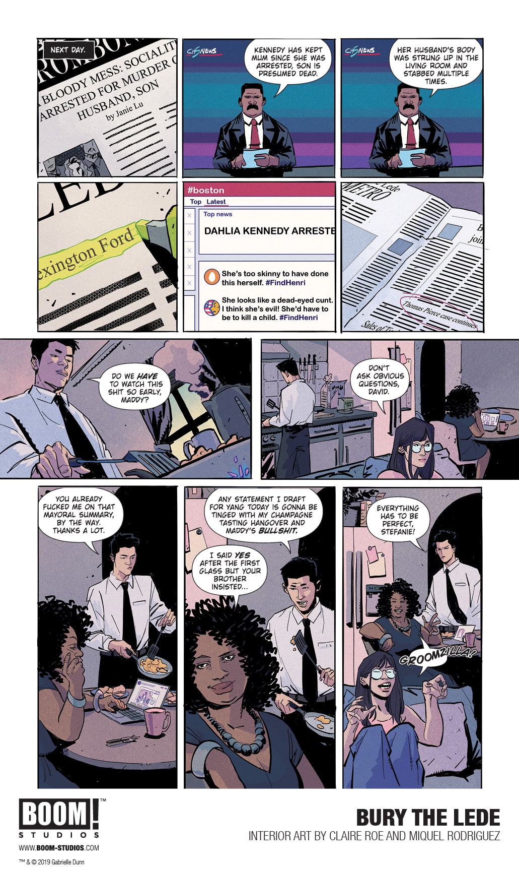 Now, you too can experience what it’s like to be a journalist by checking out this first look preview of Bury the Lede, a new original graphic novel by Gaby Dunn, Claire Roe, and Miquel Rodriguez, published by explosive publisher BOOM! Studios this Fall. A press release provides further details: