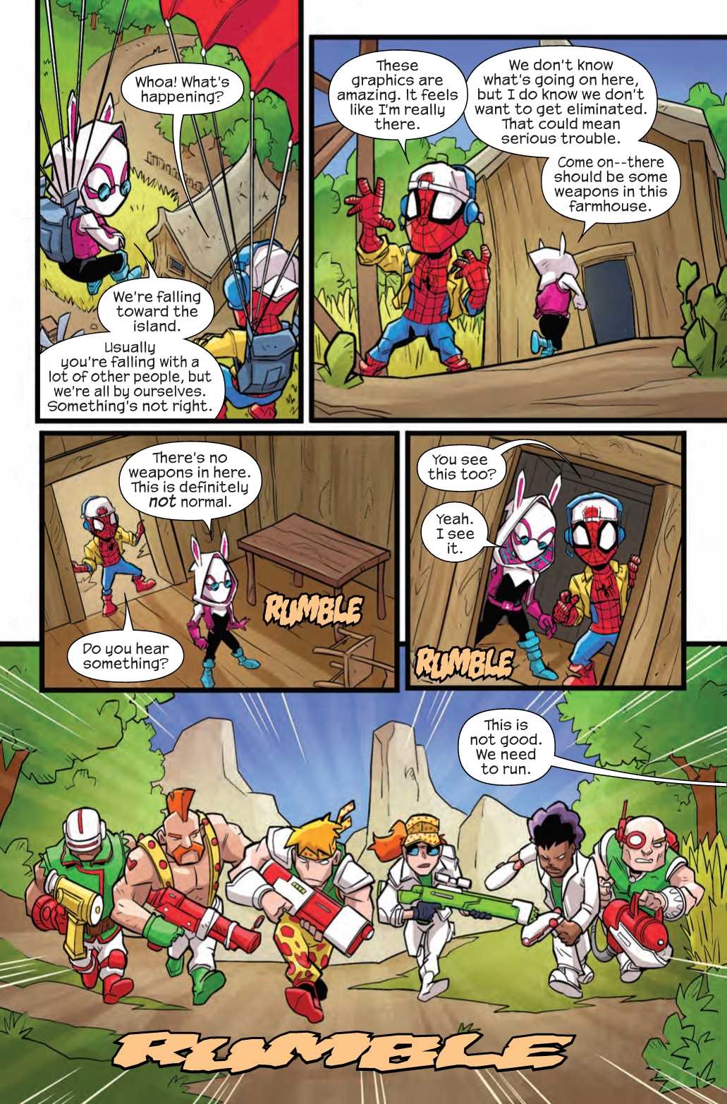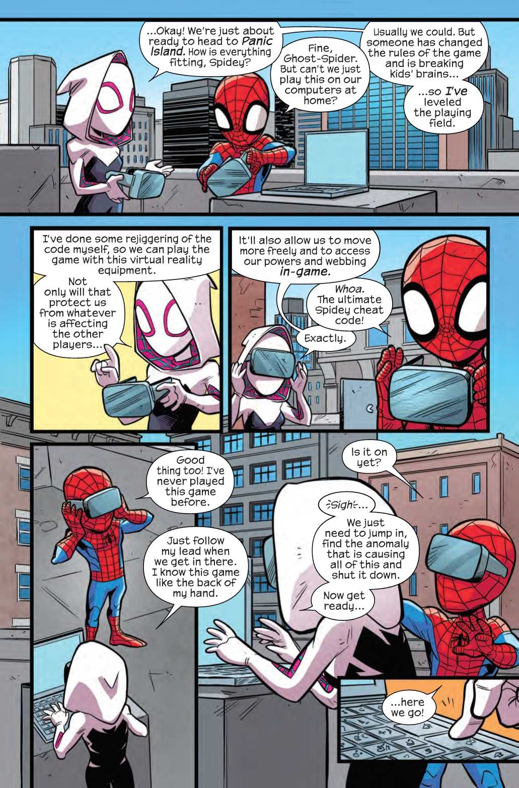 Well, true believers, you’ll be happy to learn that Spider-Man may have a good reason for breaking the rules. You see, Panic Island is turning kids into mindless zombies, and Spiders Man and Gwen are heading into the game to rescue them.