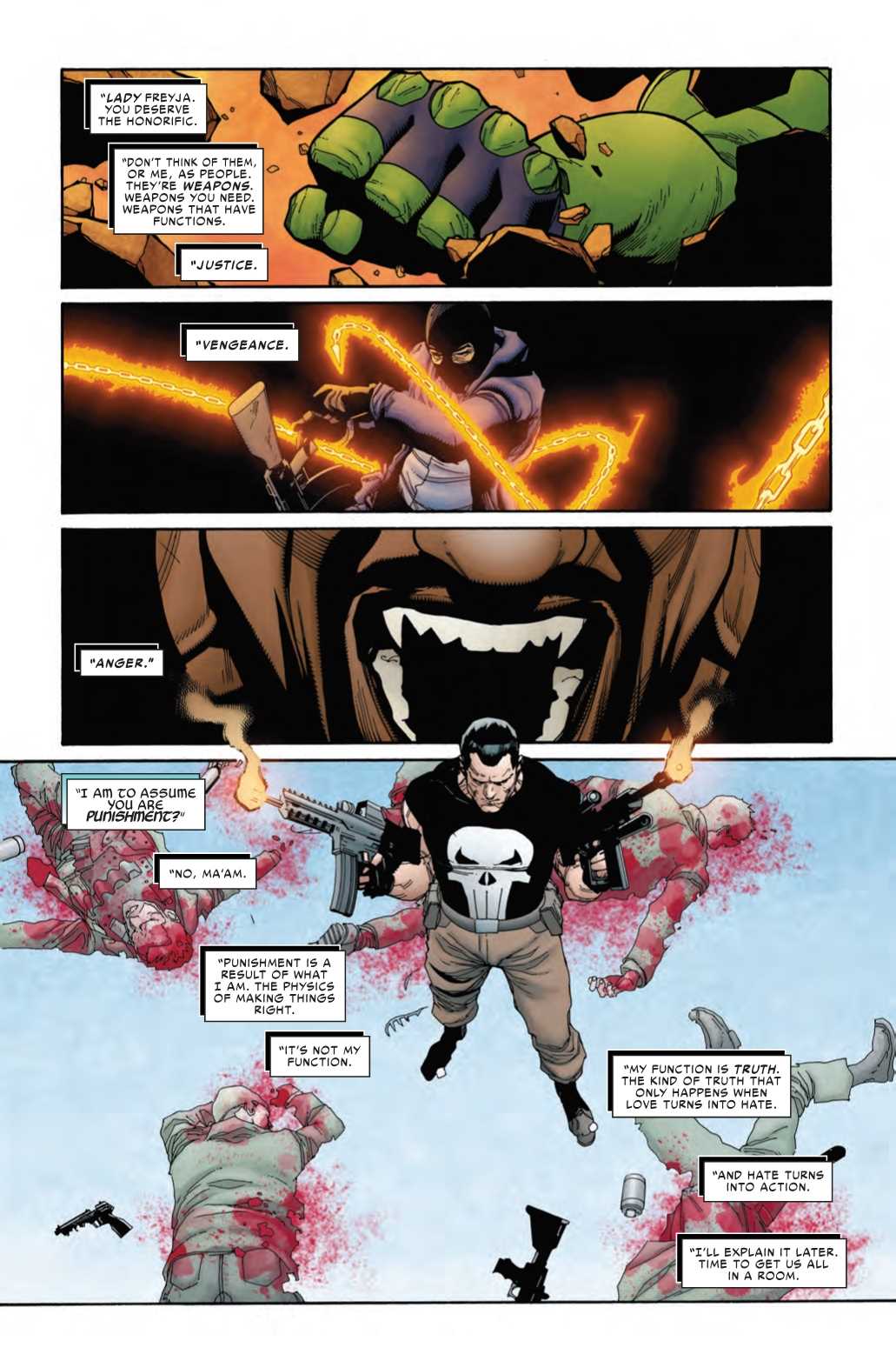 The Punisher isn’t generally known for his skills as a philosopher or a poet. He’s more well-known for his skills with bullets and murder. But nevertheless, Frank Castle waxes philosophical in this preview of War of the Realms: Strikeforce: Dark Elf Realm #1. Frank is having a conversation with Freya after being recommended by Captain America for an important role in the War of the Realms…