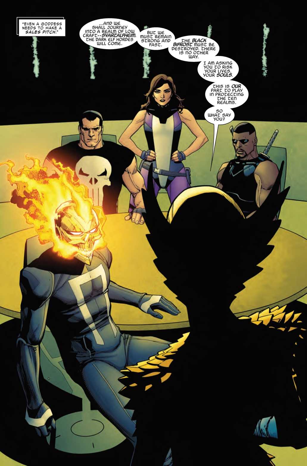 Deep in the swamps of Svartalfheim stands the Black Bifrost, Malekith’s corrupted Rainbow Bridge and the only reliable means of travel between the realms with the true Bifrost in pieces. If the gods are going to stop Malekith’s invasion, the Black Bridge must fall. With her son missing and husband injured, Lady Freyja must take up the challenge herself. But she won’t go alone. Hulk (Jen Walters), the Punisher, Blade and Ghost Rider follow the All-Mother of Asgard straight into Malekith’s home territory!