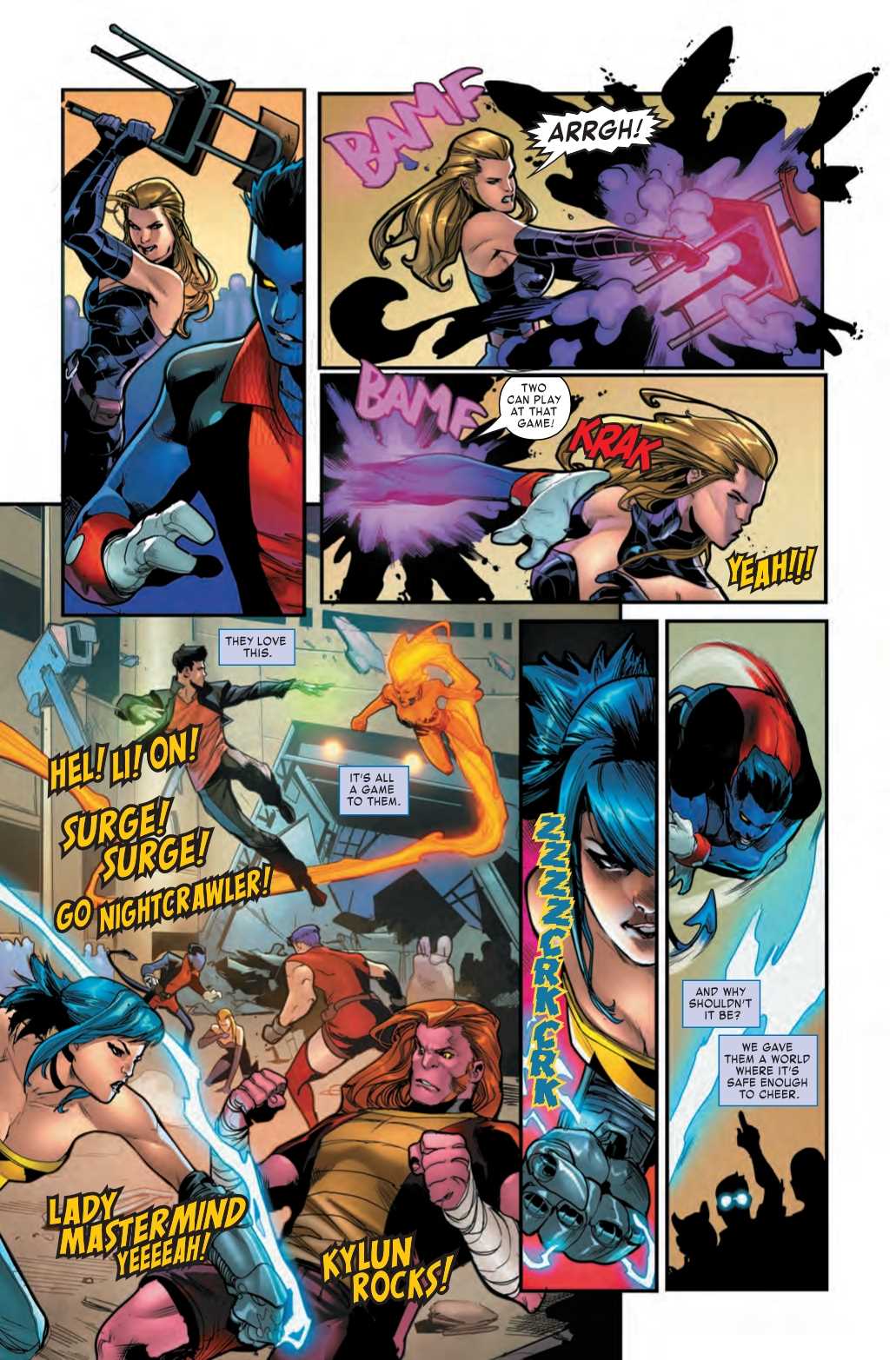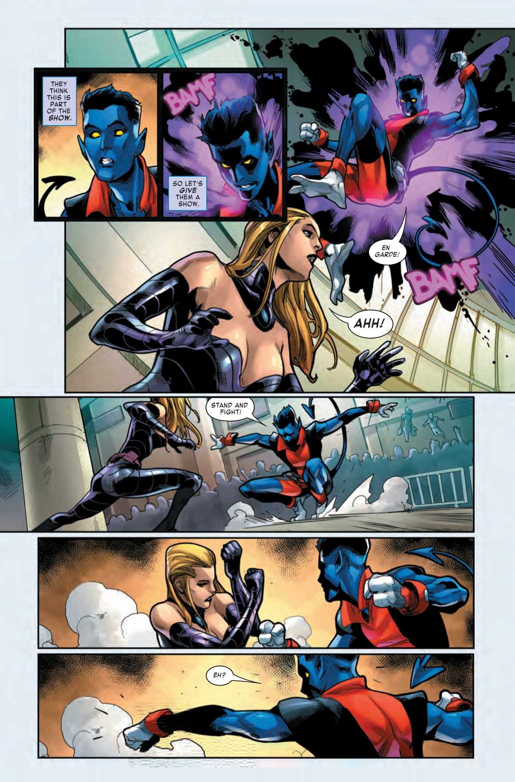 In the world of Age of X-Man, Nightcrawler is a fancy Hollywood movie star, an idle of millions. But in this preview of Age of X-Man: Amazing Nightcrawler #4, Nightcrawler ventures into the territory of a much more low-brow form of entertainment: professional wrestling. At least, that’s what appears to be going on in the preview, as Nightcrawler and his associates take on Lady Mastermind and her crew in an Extreme Rules match at the Mall.