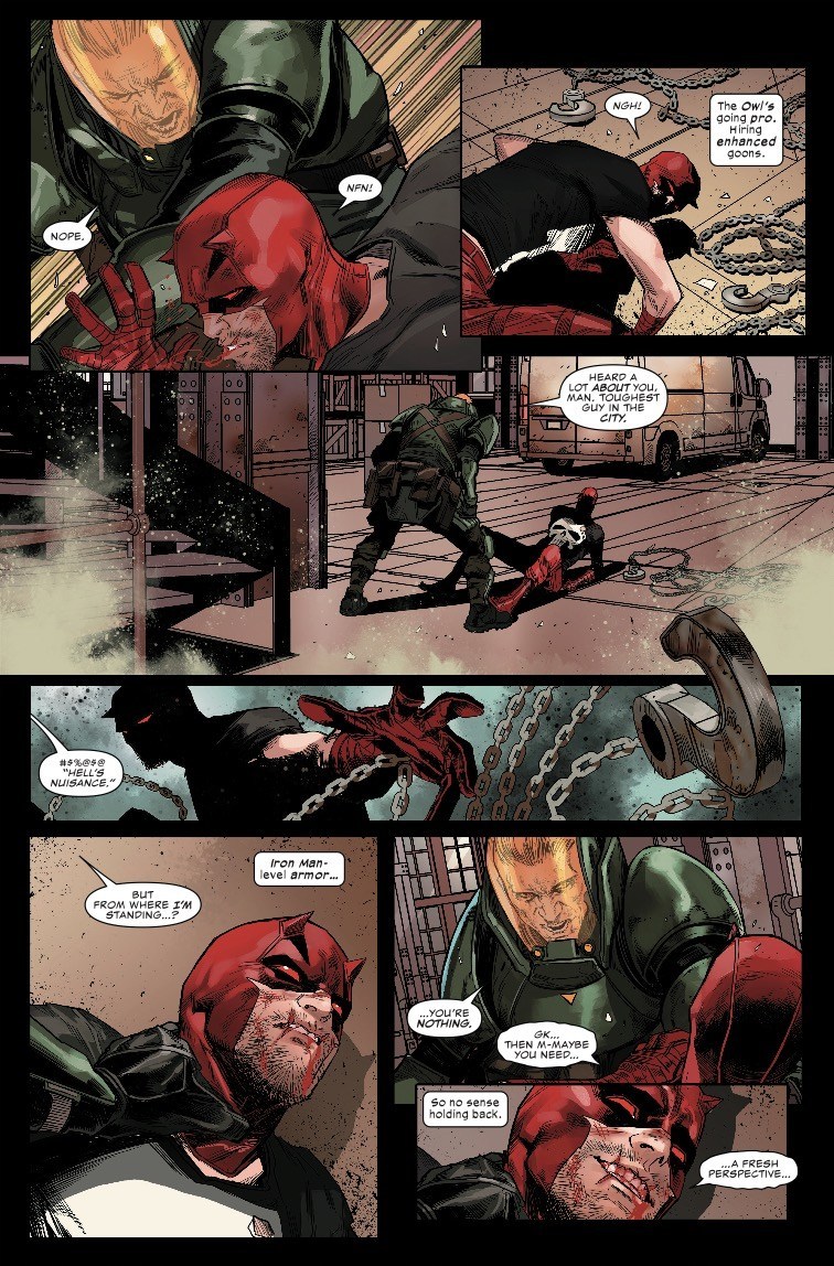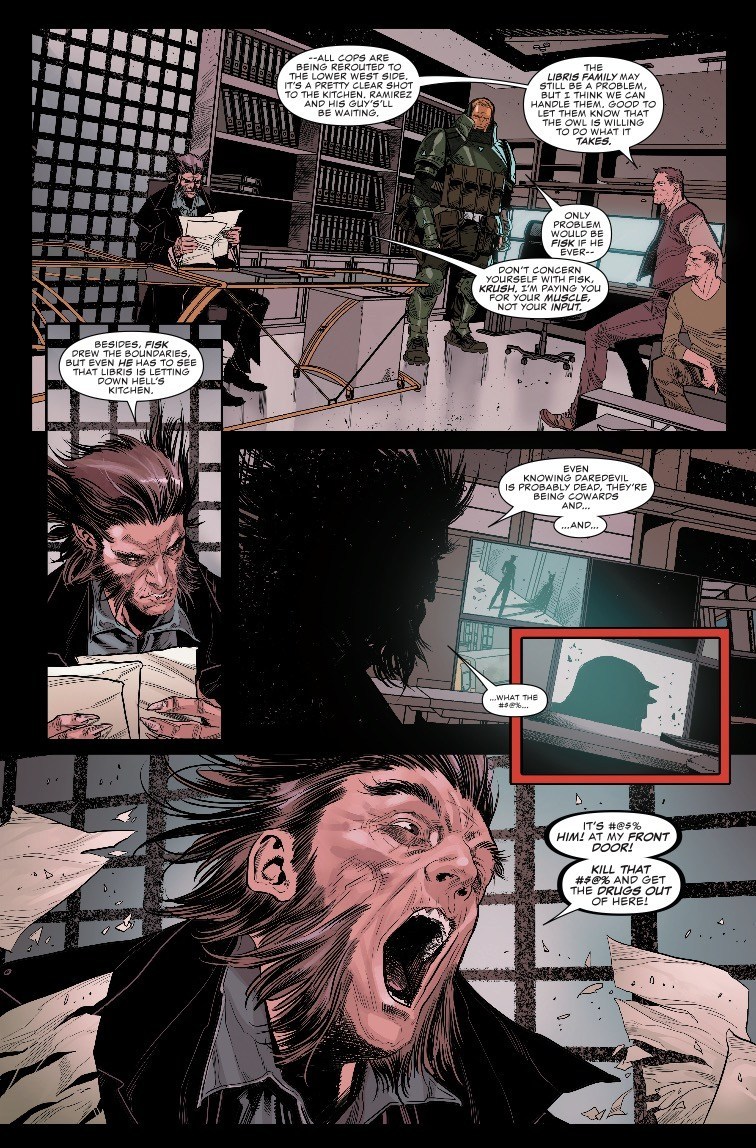 The Daredevil starring in the latest Daredevil relaunch isn’t the Daredevil you may be used to. This is a grimmer Daredevil. A grittier Daredevil. A Daredevil who wears a Punisher t-shirt. This is basically the Snyder Cut of Daredevil is what we’re saying. So when The Owl finds out that Daredevil is about to break into his drug manufacturing facility in this preview of next week’s Daredevil #5, he knows what he has to do…