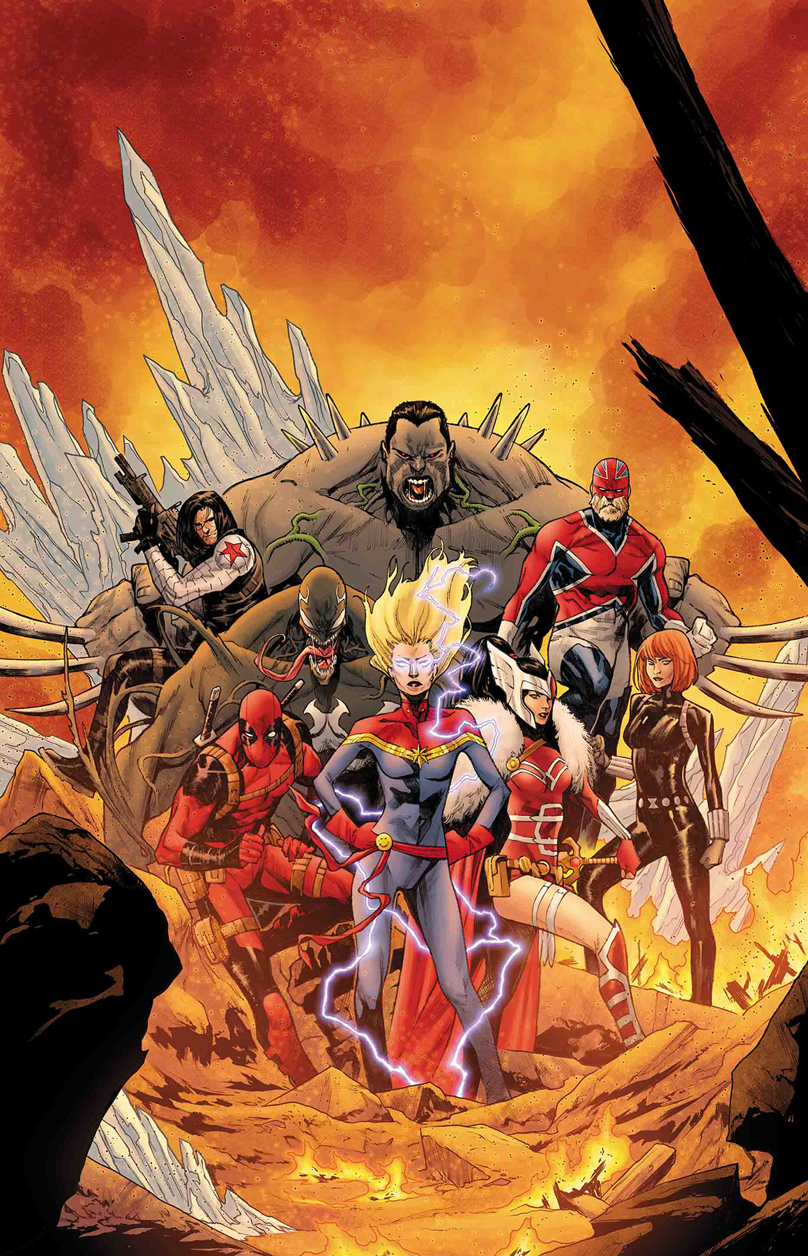 While two other Strikeforce teams head out to other realms, Captain Marvel leads the fight to reclaim the Earth! But even with a crew of heavy hitters (Weapon H, Captain Britain, Venom, Deadpool) and two of the best spies on the planet (the Winter Soldier and the Black Widow), Carol’s fighting a losing game. Malekith’s allies are without number – and the battlefield bigger than any Carol’s commanded before. Time to lay it all out on the line – and fight for a miracle.