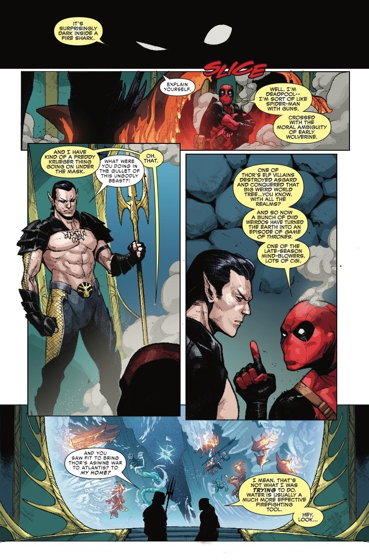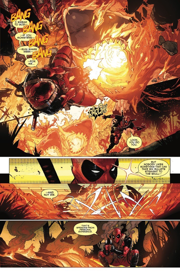 A lot of people believe that Deadpool jumped the shark years ago, possibly around the time he started lifting all his jokes from the movie Airheads, but in this preview of next week’s War of the Realms: Strikeforce: War Avengers #1 (long enough title for you?), Deadpool takes jumping the shark to the next level, because he’s facing off against a bunch of fire-breathing flying shark monsters…
