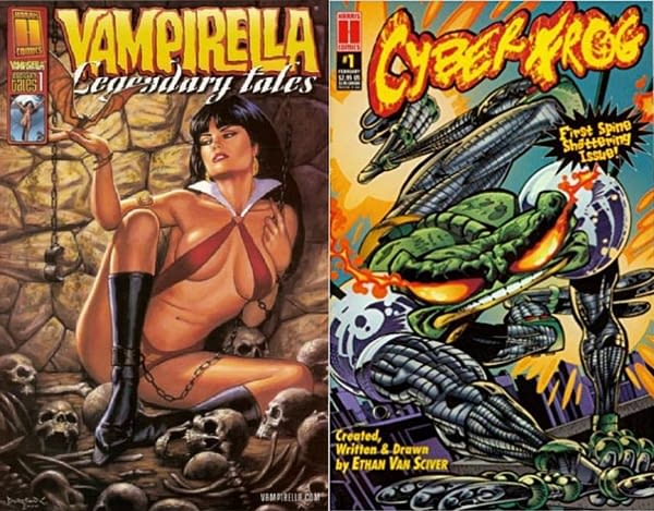 The latest, it seems, is Ethan Van Sciver. No longer working for major comics publishers and fresh from last summer’s very successful Indiegogo campaign for Cyberfrog: Blood Honey, the comic is yet to be published. But Ethan is now commissioning himself to draw Cyberfrog variant covers to Dynamite Entertainment titles, showing his cyborg amphibian interacting with other characters published by Dynamite. At one point, Vampirella and Cyberfrog were both published by Harris Publications, and he’s done artwork for Vampirella trading cards and inked the Vampirella/Shadowhawk crossover in the day, so this wouldn’t be the first time he’s been involved with the character. But I hear there are more to come, one might consider Chaos!, Pantha and others as prime Cyberfrog crossover comic book cover candidates.