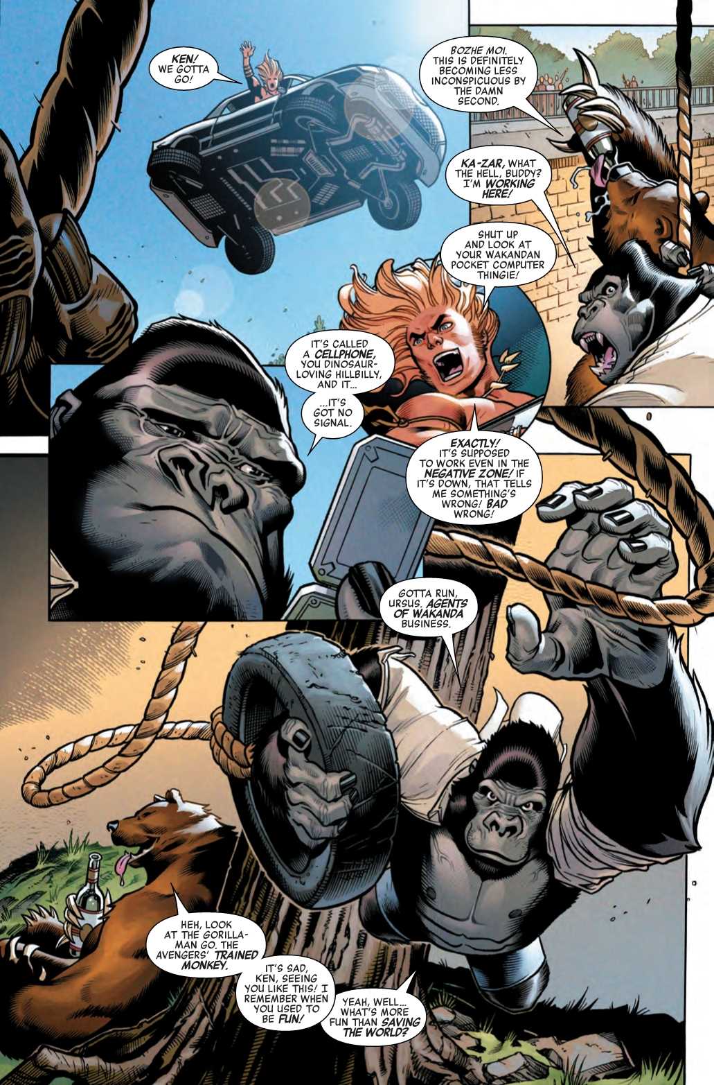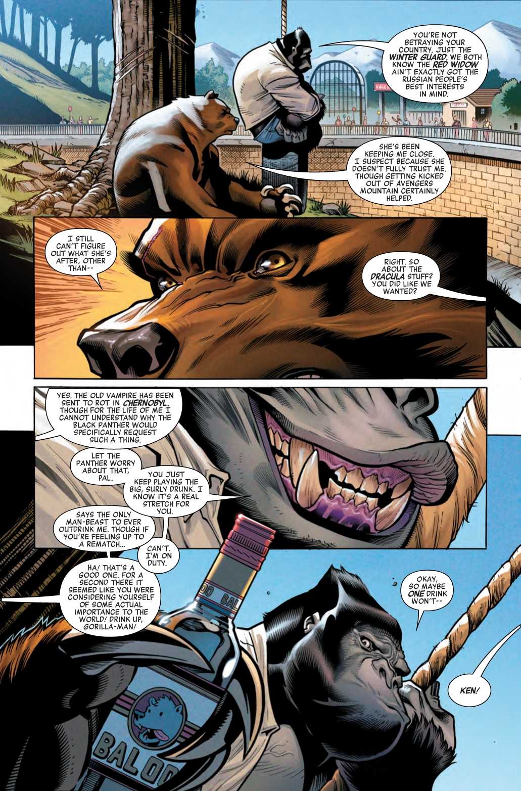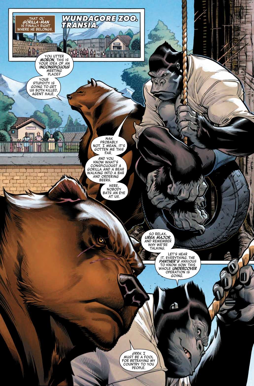 The long-anticipated Mueller Report was unable to conclude that President Donald Trump colluded with Russia to rig the 2016 election, or, as the president so eloquently put it, no collusion, no obstruction, MAGA. But in this preview of Avengers #19, there is definitely collusion with Russia… but it’s not the Americans. Instead, it’s Gorilla-Man, an agent of Wakanda, meeting up with the Winter Guard’s Ursa Major, in a zoo.