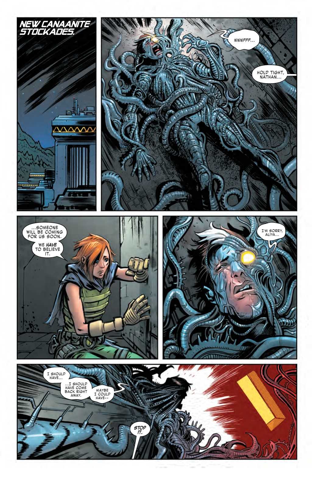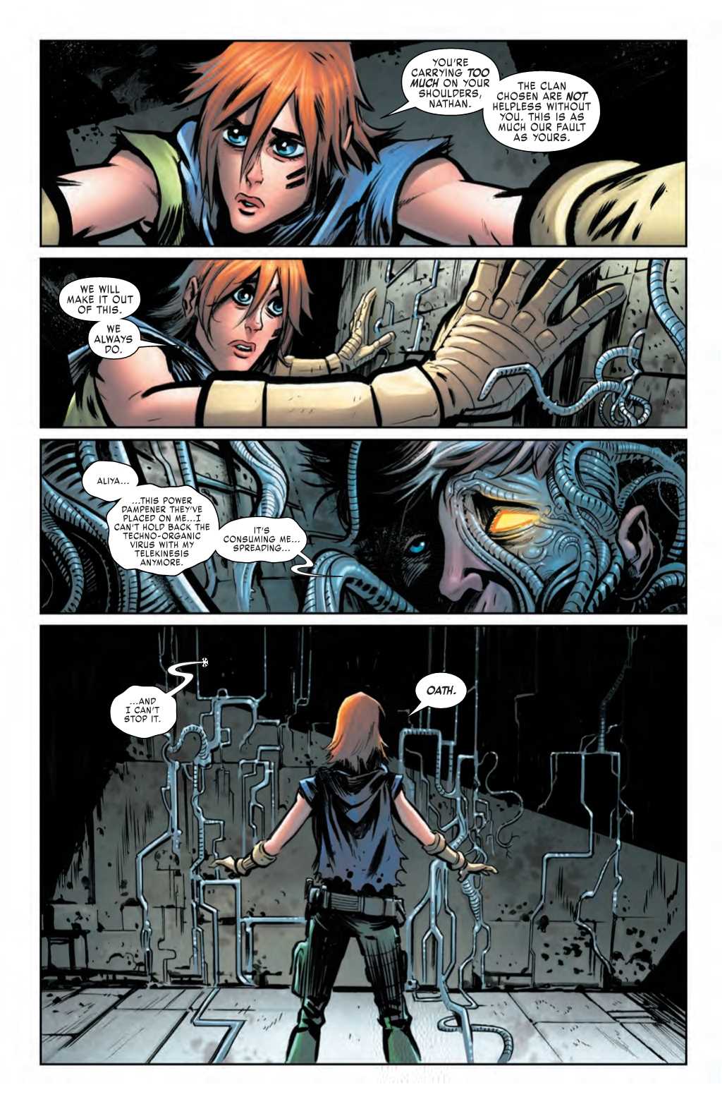 In the previous issue of X-Force by Ed Brisson and Dylan Burnett, we learned the shocking fact that Cable is an anti-vaxxer, threatening to infect the population with his techno-organic virus. In this preview of next week’s X-Force #8, we see that the situation hasn’t improved, and, in fact, Cable’s techno-organic virus is completely out of control!