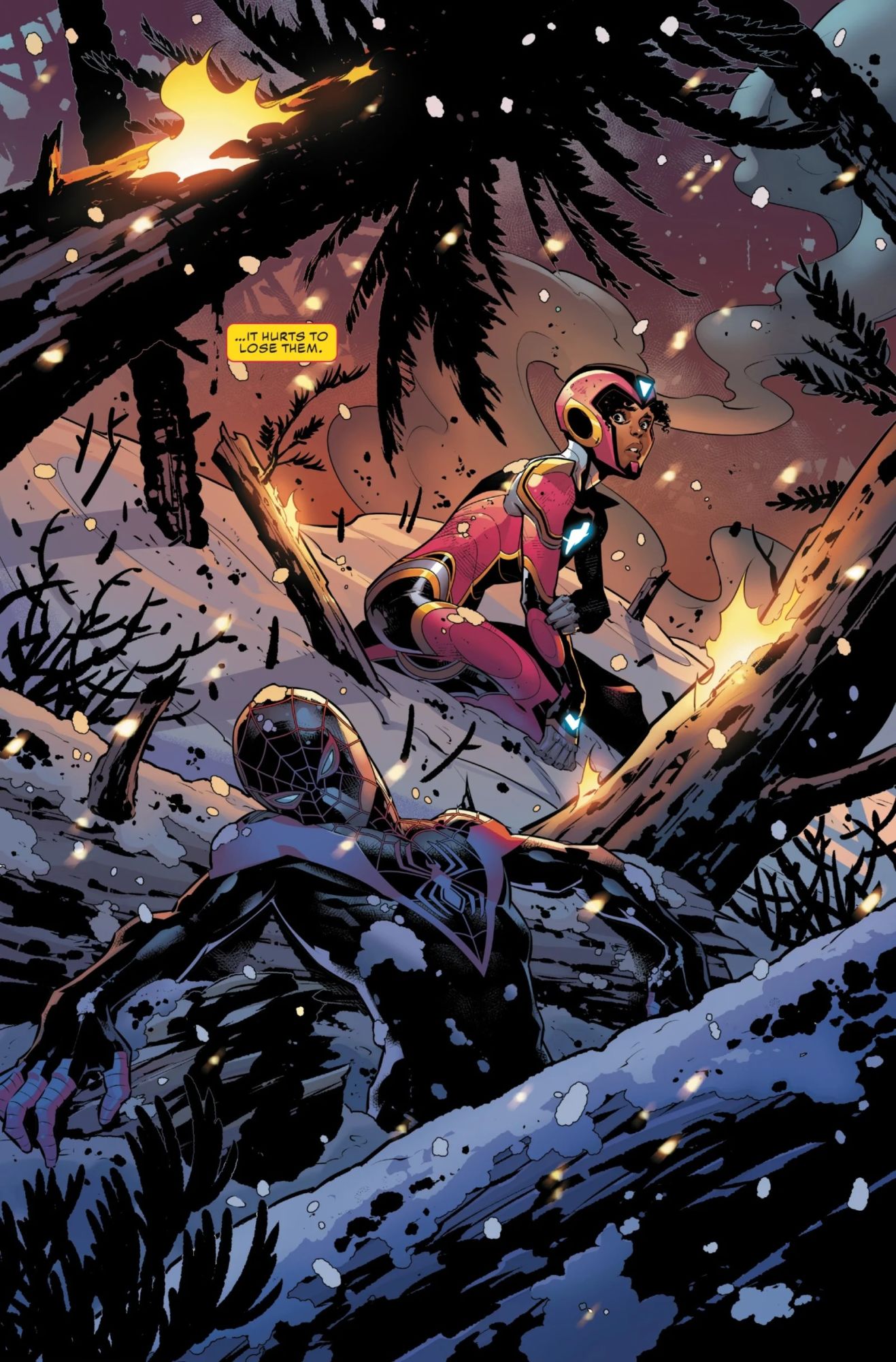 And now, in this Ironheart #6 preview stolen from an AV Club EX-X-XCLUSIVE., we see another Spider-Man, Miles Morales, end up suffering for his association with an Iron person, Ironheart. It starts when Ironheart goes looking for a missing Miles Morales…