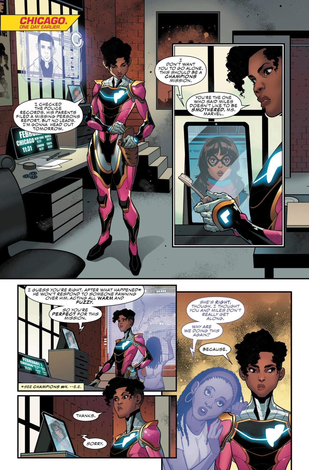 Miles has been missing after the events of Champions #4, and Riri is the best person to find him.
